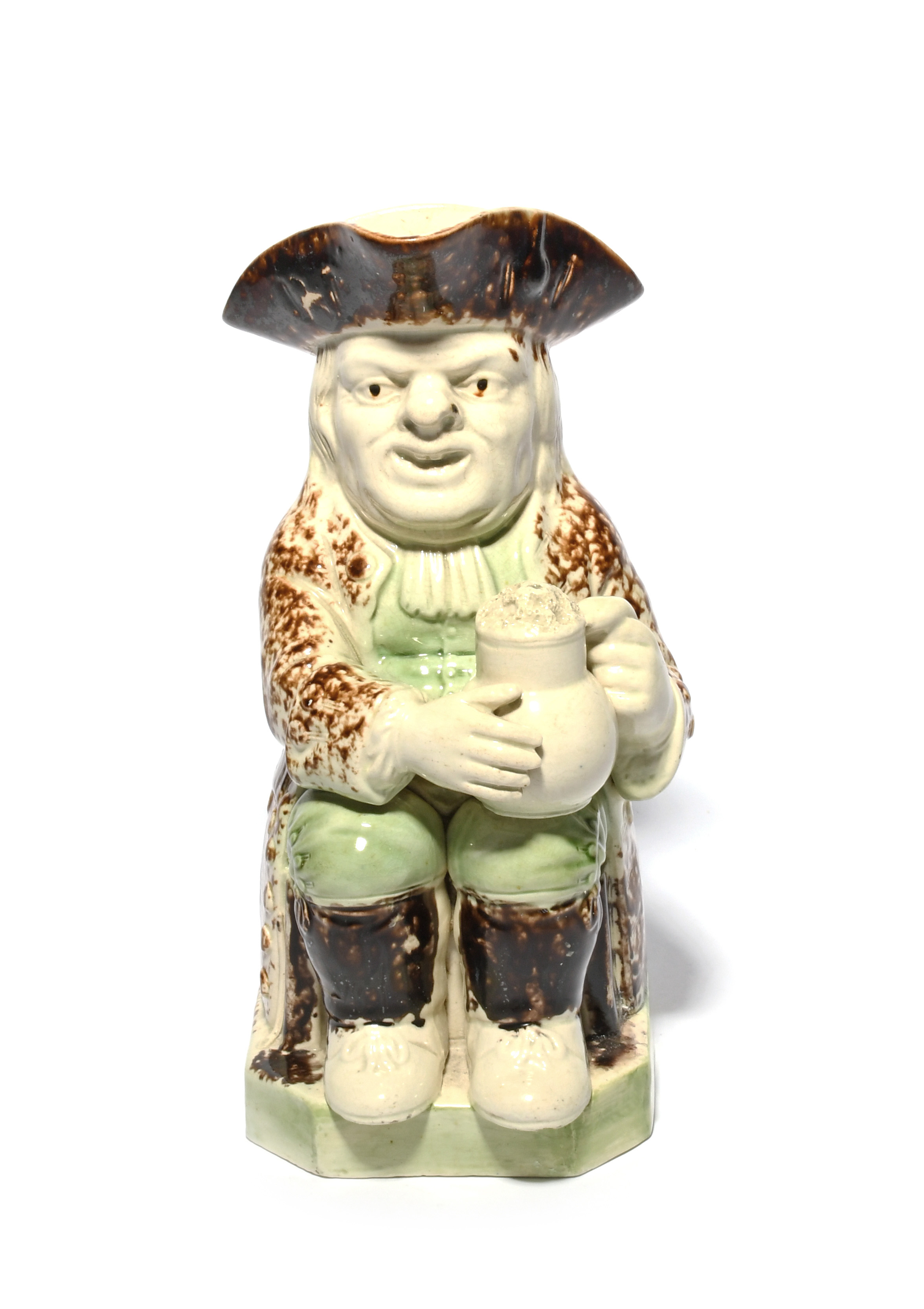 A creamware Wood type Toby jug, c.1790, seated with a foaming jug of ale, his waistcoat and breeches washed in a pale green, his coat, hat and stockings sponged with manganese, some restoration to one side of the base, 25.2cm.