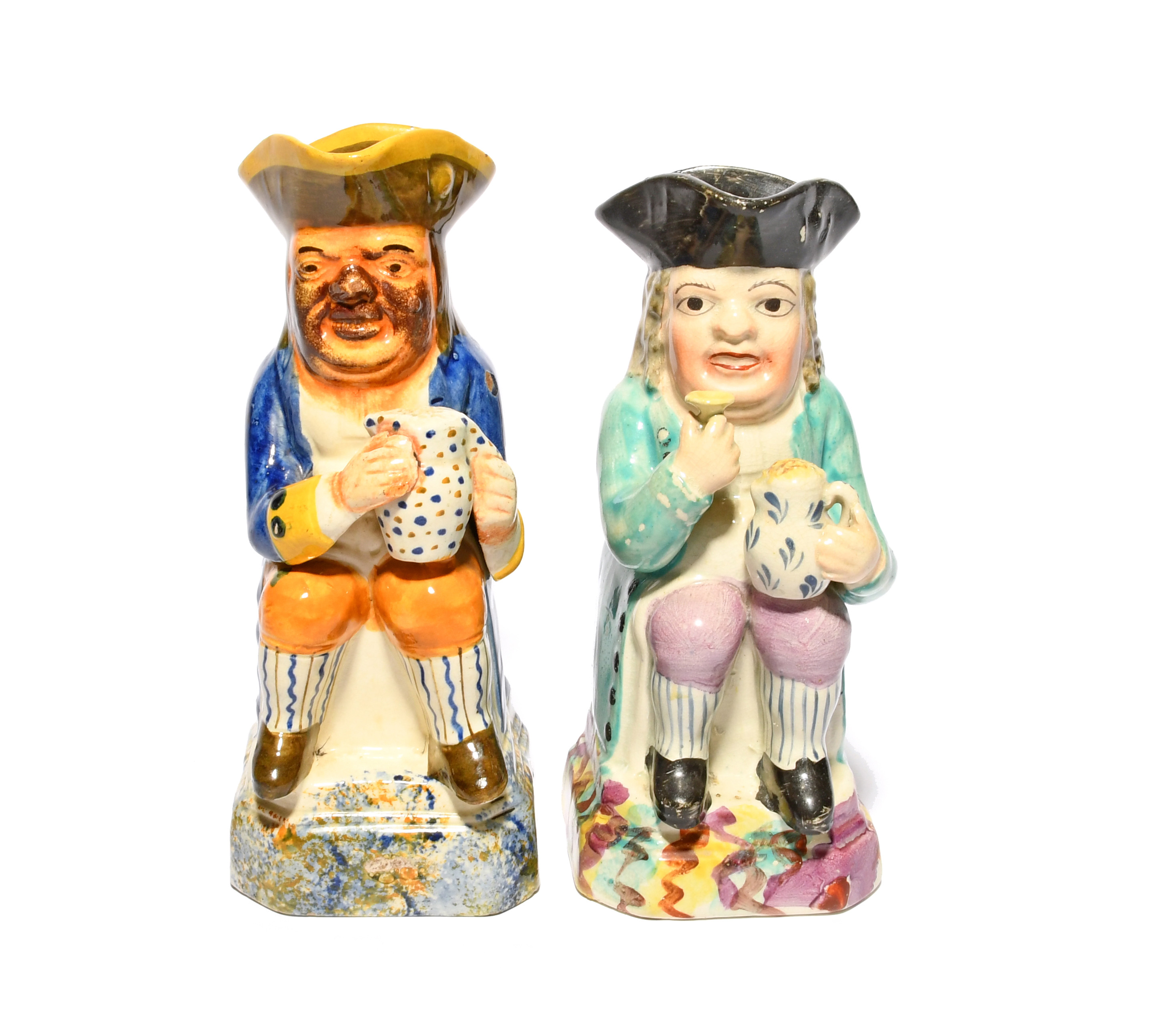 A small Pratt ware Toby jug, c.1800-10, seated on a tall base and holding a jug of ale decorated with polka dots, the base sponged in blue and ochre, and a second small Toby jug, wearing a turquoise coat over lilac breeches and holding a glass to his lips, the second toby's handle a replacement, 19cm max. (2)