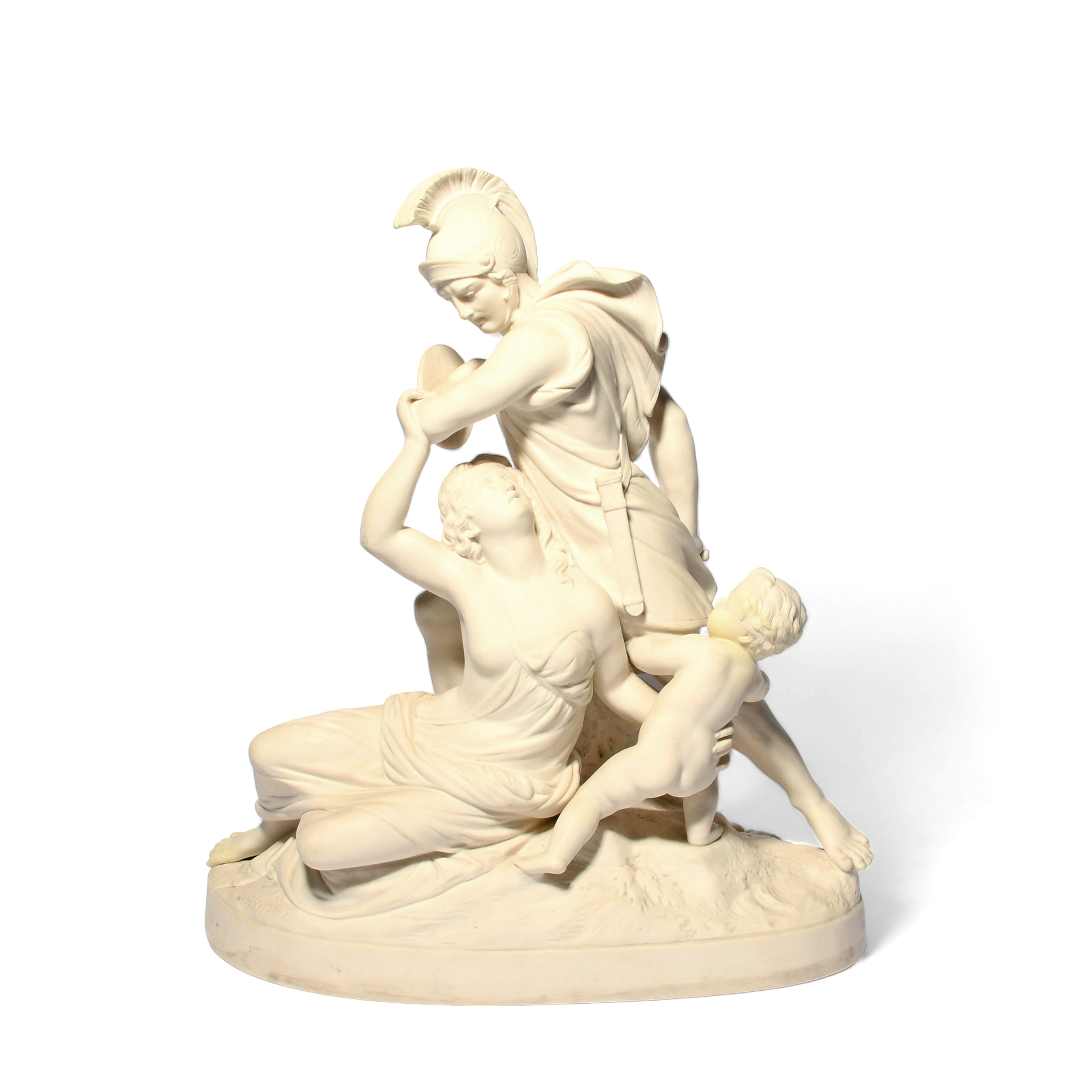 A large Minton Parian figure group of Love Restraining Wrath, date code for 1885, with Venus and Cupid hampering the progress of an armed centurion, raised on an oval base, impressed marks, some restoration, 42cm high.
