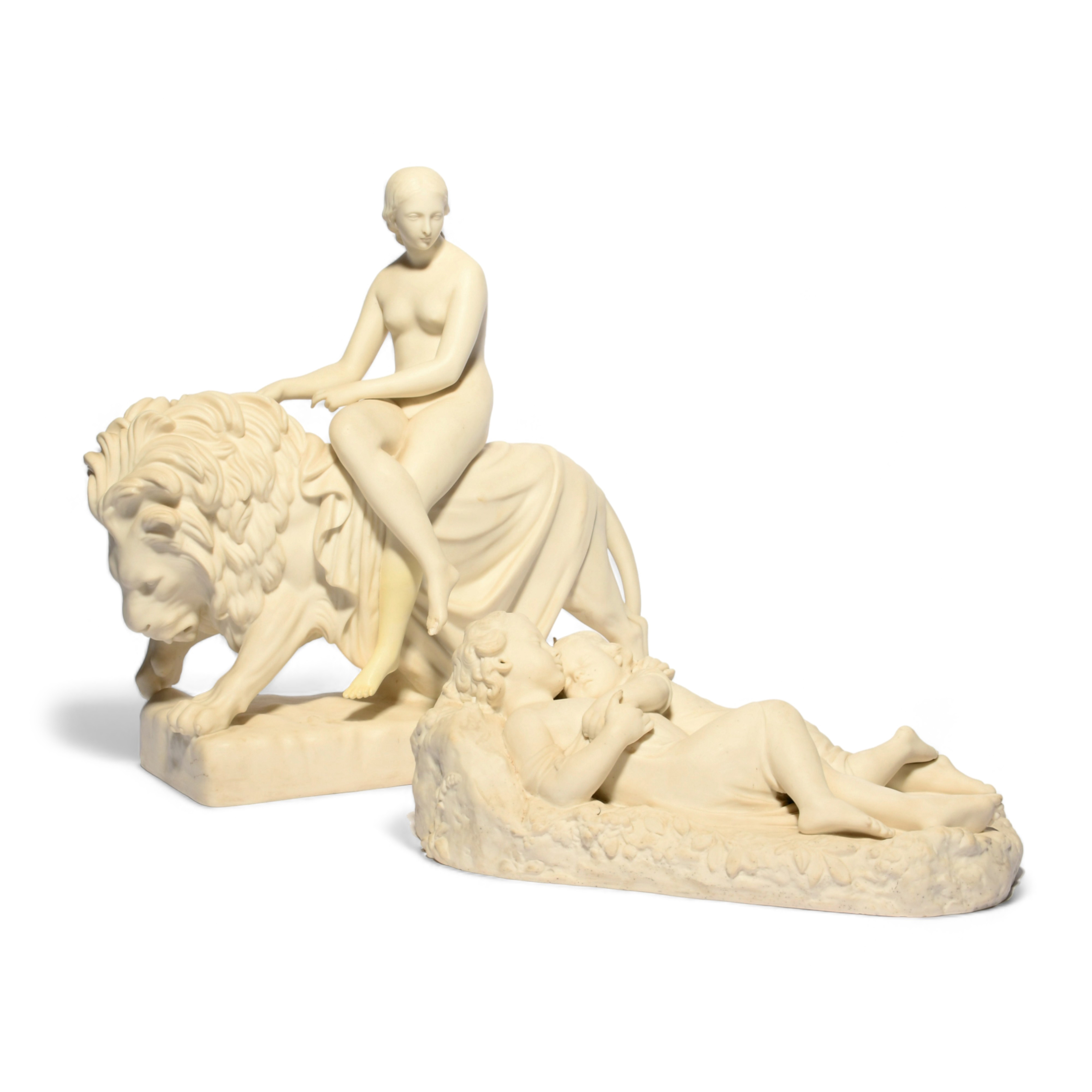 A large Minton Parian model of Una and the Lion, c.1860, by John Bell, the maiden seated sideways on the back of her faithful companion and holding his mane in one hand, and a Minton Parian model of the Babes in the Wood, sleeping on the woodland floor, restoration to Una's left leg, 38cm max. (2)