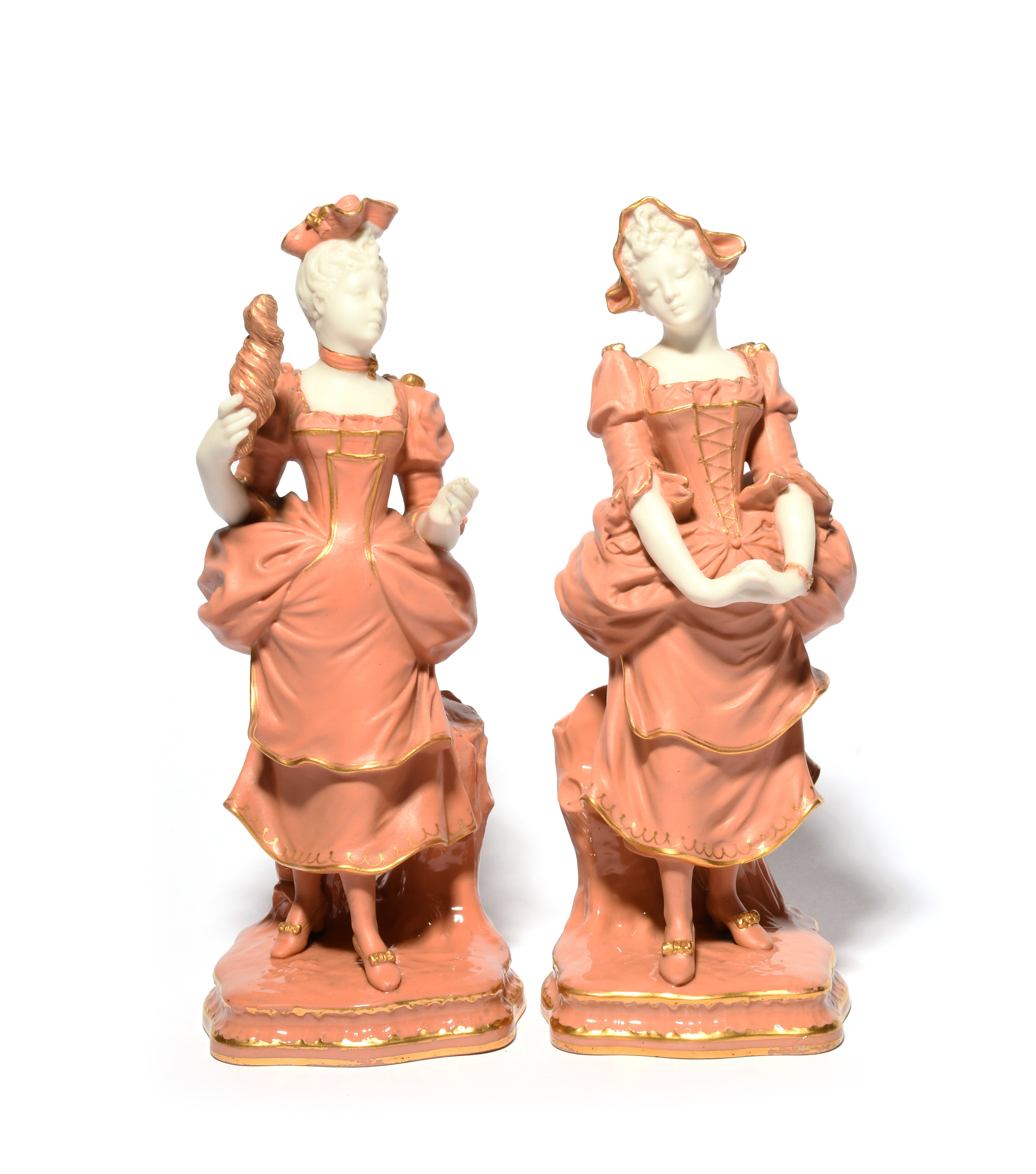 An unusual pair of Minton figures, c.1895-1900, of high society ladies wearing bustle dresses, decorated in a rich coral pink, their faces and arms left in the white, one with a gilt monogram for Marc-Louis Solon, gilt globe mark and indistinct swan date mark, 25.8cm max. (2)