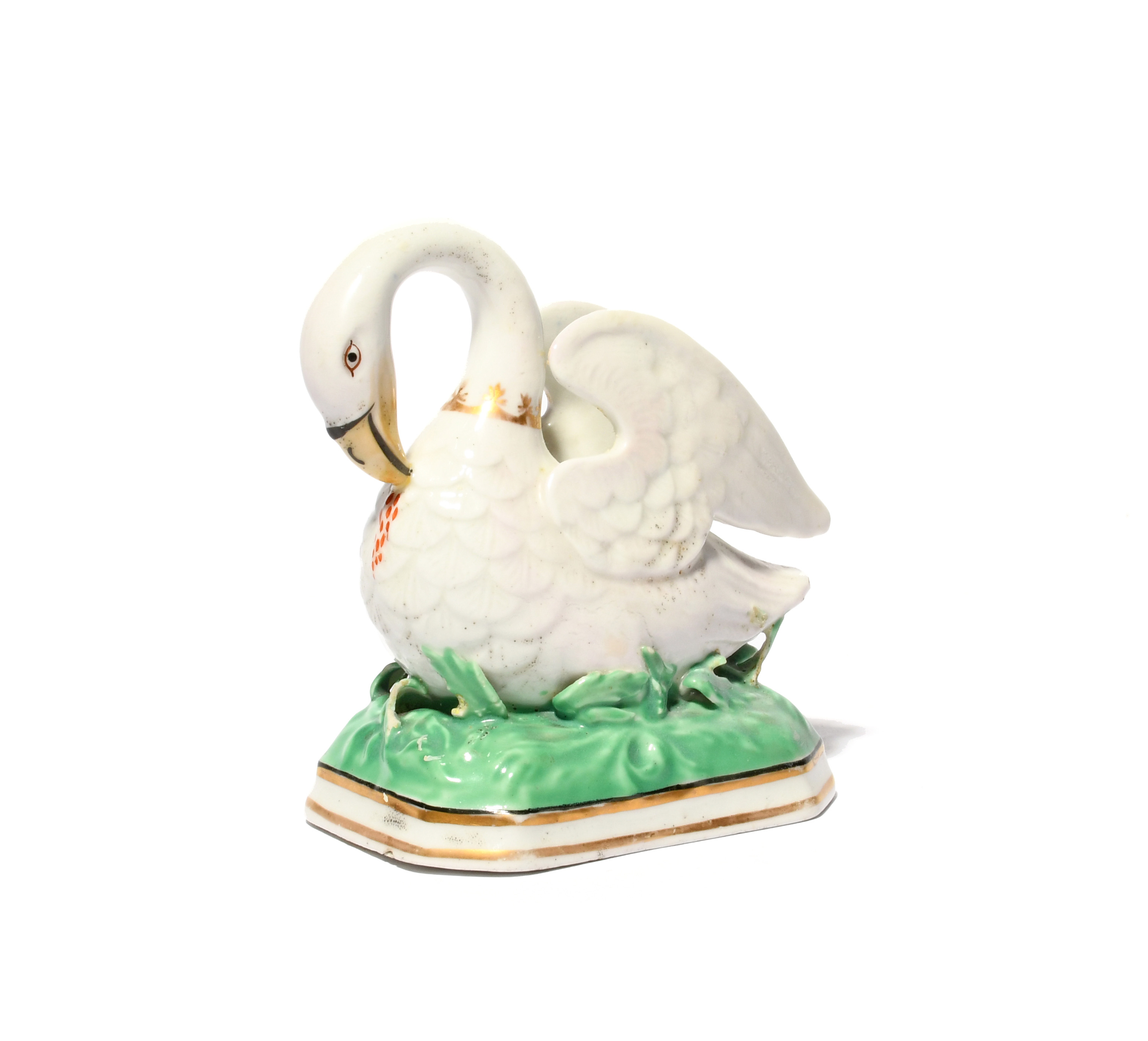 A rare Chamberlain's Worcester figure of the Pelican in her Piety, c.1810-20, the bird modelled with wings raised behind, her beak piercing her breast to draw blood, raised on a chamfered rectangular base, puce script mark, good restoration to one wing tip, 9.3cm high.