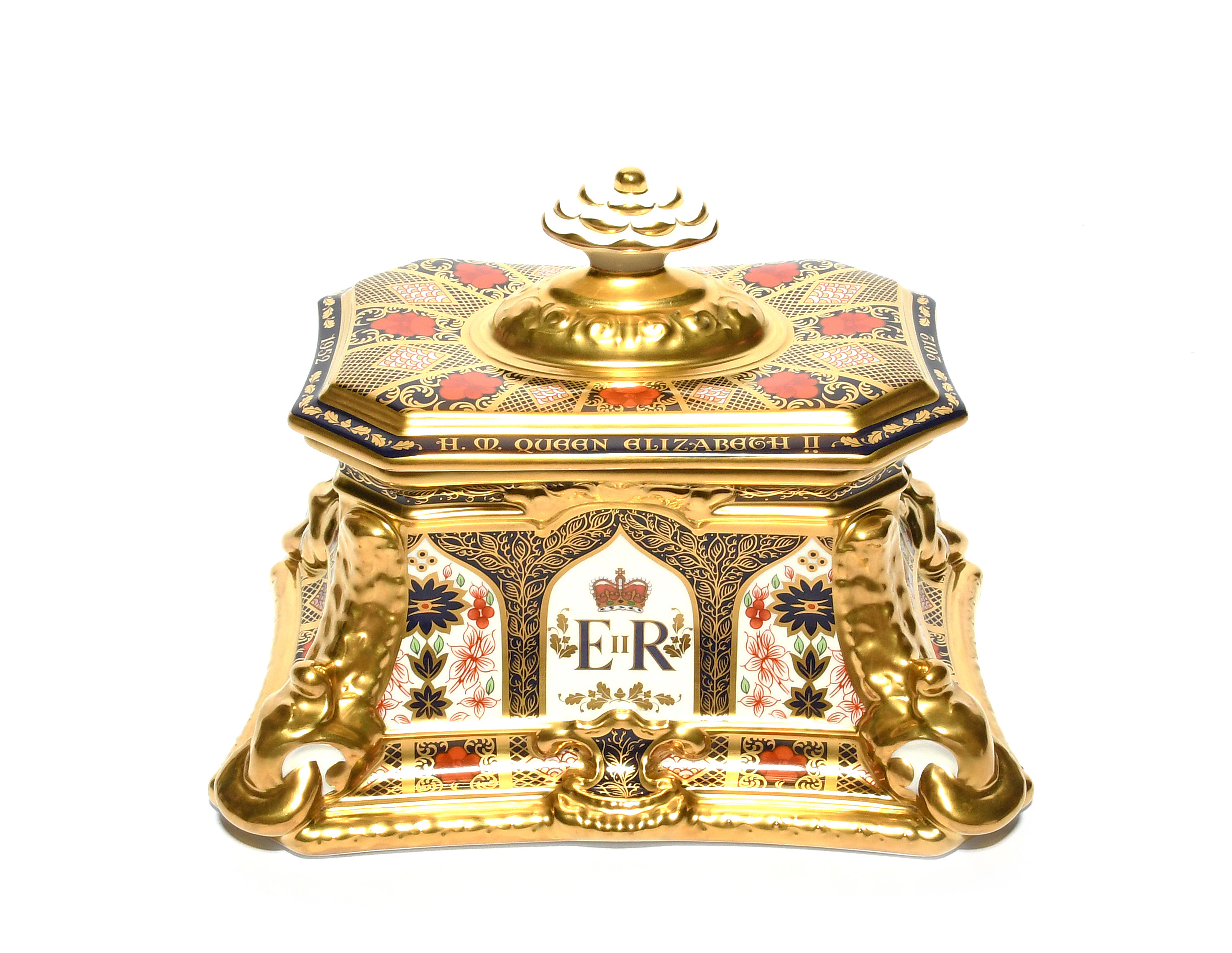 A good and rare Royal Crown Derby commemorative casket, 2012, produced to celebrate the Diamond Jubilee, finely decorated in the Imari palette and inscribed 'HM Queen Elizabeth II', the front decorated with her Royal cipher, 22.5cm. Together with its original box and certificate showing it to be number 59 of a limited edition of 60. (2)
