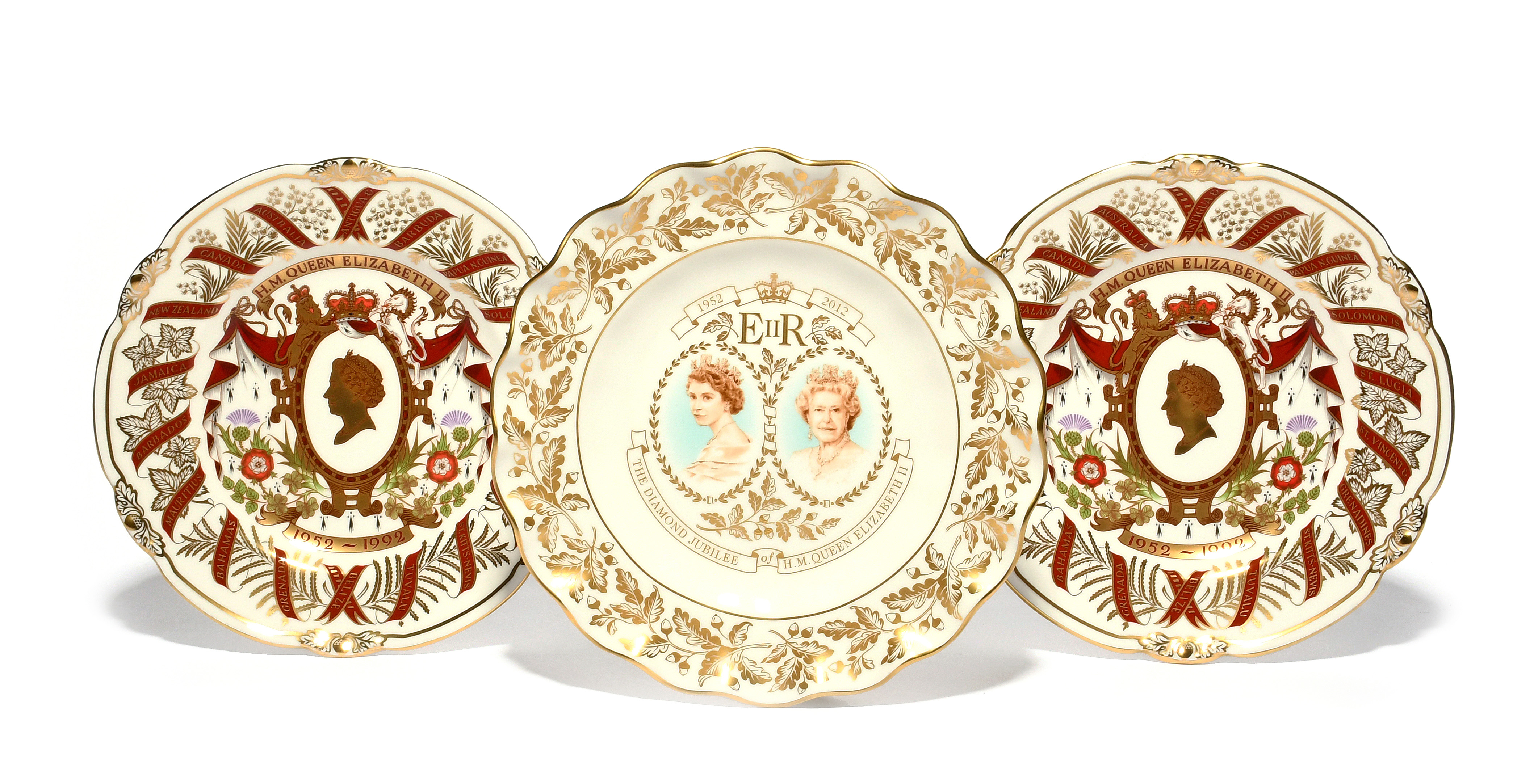 Three Royal Crown Derby commemorative plates, modern, two for the Ruby Jubilee of Queen Elizabeth II, numbers 38 and 123 of a limited edition of 500, and the other for her Diamond Jubilee, number 90 of a limited edition of 750, in their original boxes. (3)