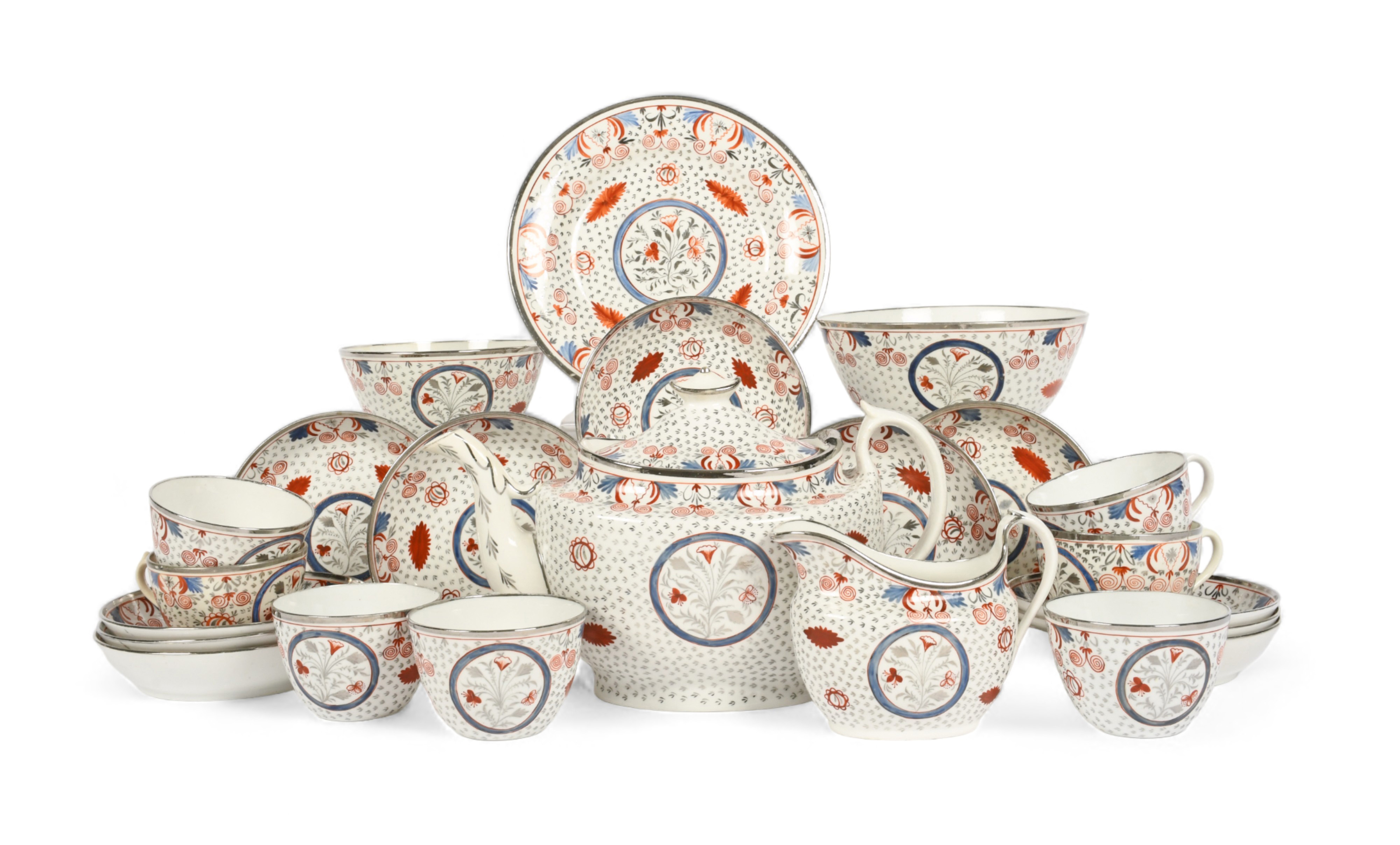 A rare Factory Z (Staffordshire) porcelain part tea service, c.1800, decorated in red, blue and silver lustre with a floral roundel and stylised scrolls on a ground of silvered leaf motifs. Comprising: a teapot and cover, a milk jug, a slop bowl, a sugar bowl, a cake plate, seven tea cups and 11 saucers. (24)