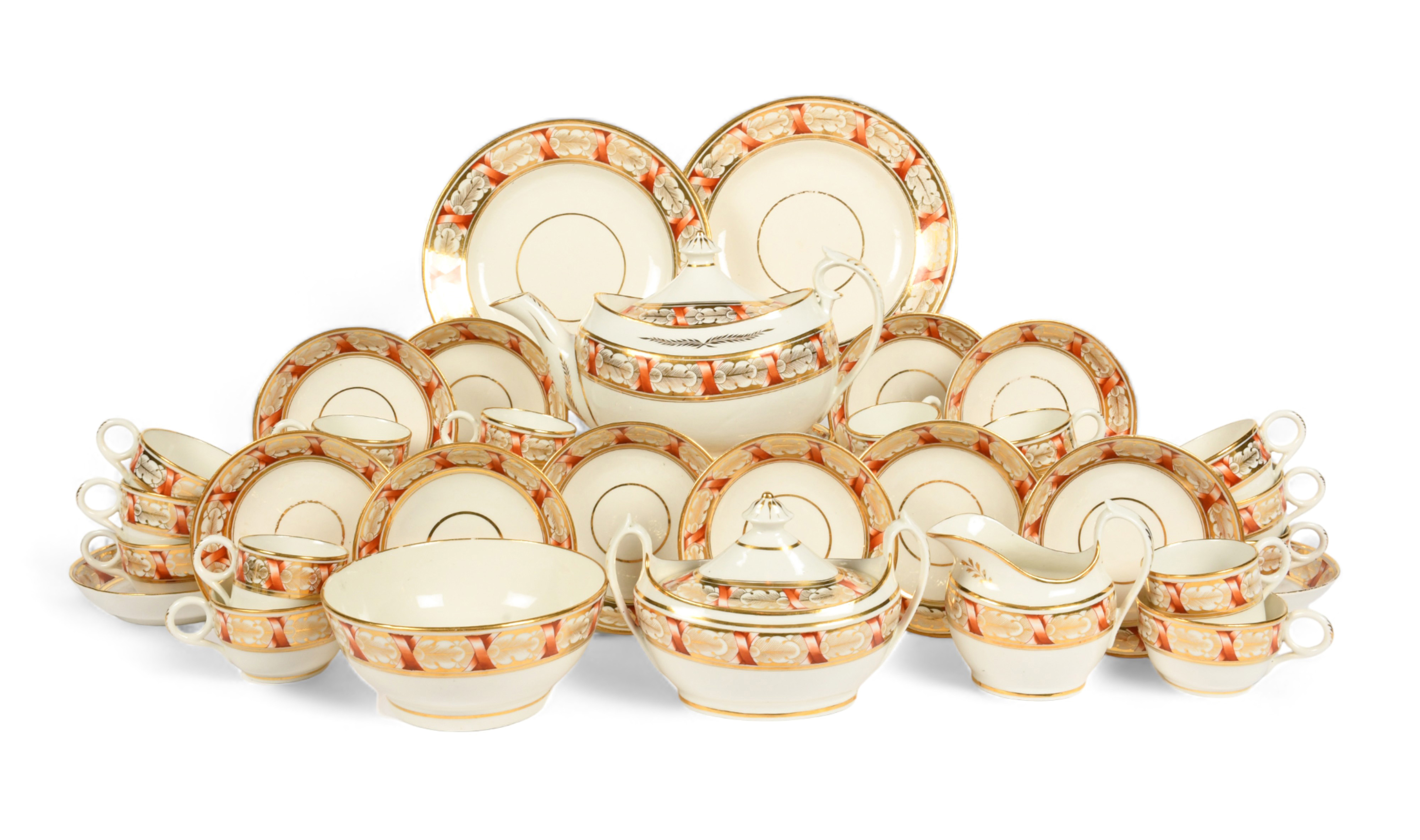 A Grainger's Worcester tea service, c.1810, decorated with bands of oak leaves wrapped in orange ribbon. Comprising: a teapot with cover and stand, a sucrier and cover, a milk jug, a slop bowl, two cake plates, 12 teacups, six coffee cans and 12 saucers. (39)