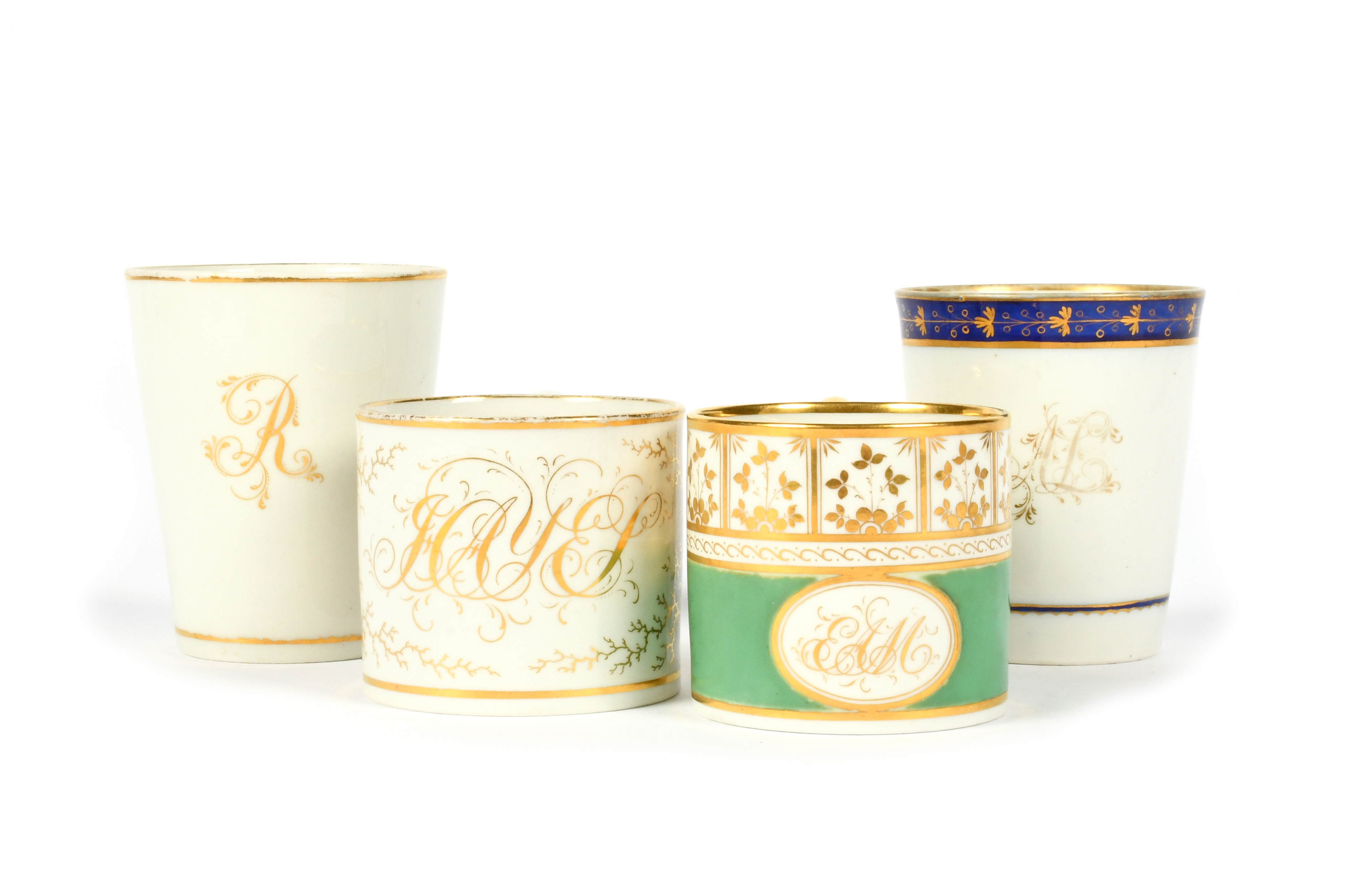 Two Barr Worcester beakers and two Flight, Barr and Barr coffee cans or small mugs, c.1800-35, the flared beakers with gilt initials, the cans similarly decorated with initials and monograms, one with gilt seaweed tendrils, another on a green ground, impressed and incised marks, 9.5cm max. (4)