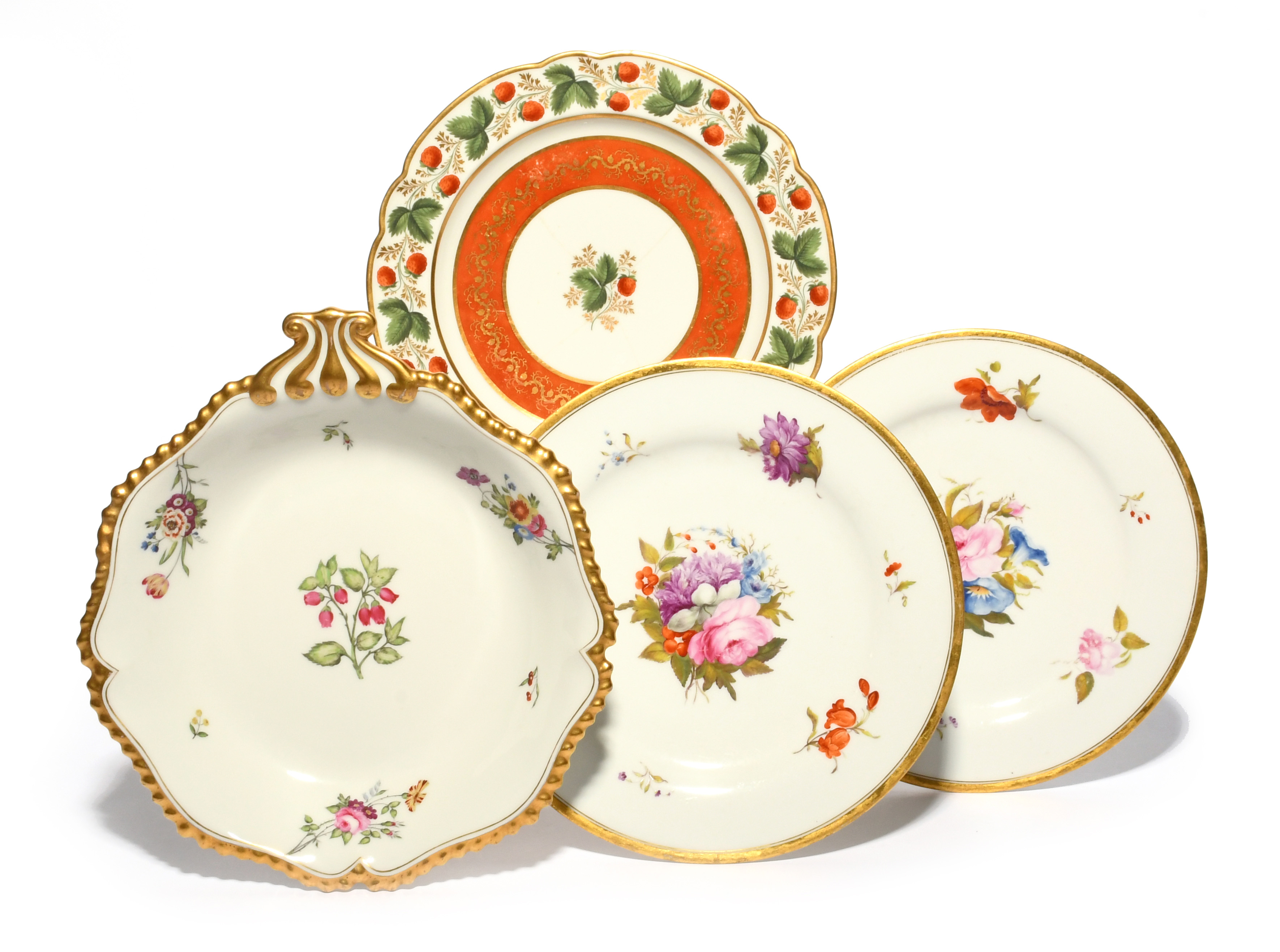 A pair of Barr, Flight and Barr small plates, c.1808-10, painted with single flower sprigs around a central floral posy, a Flight and Barr plate painted with a continuous band of strawberries, and a single-handled dessert dish painted with a spray of bilberry and further flower arrangements, various marks, the strawberry plate cracked, 23cm max. (4)