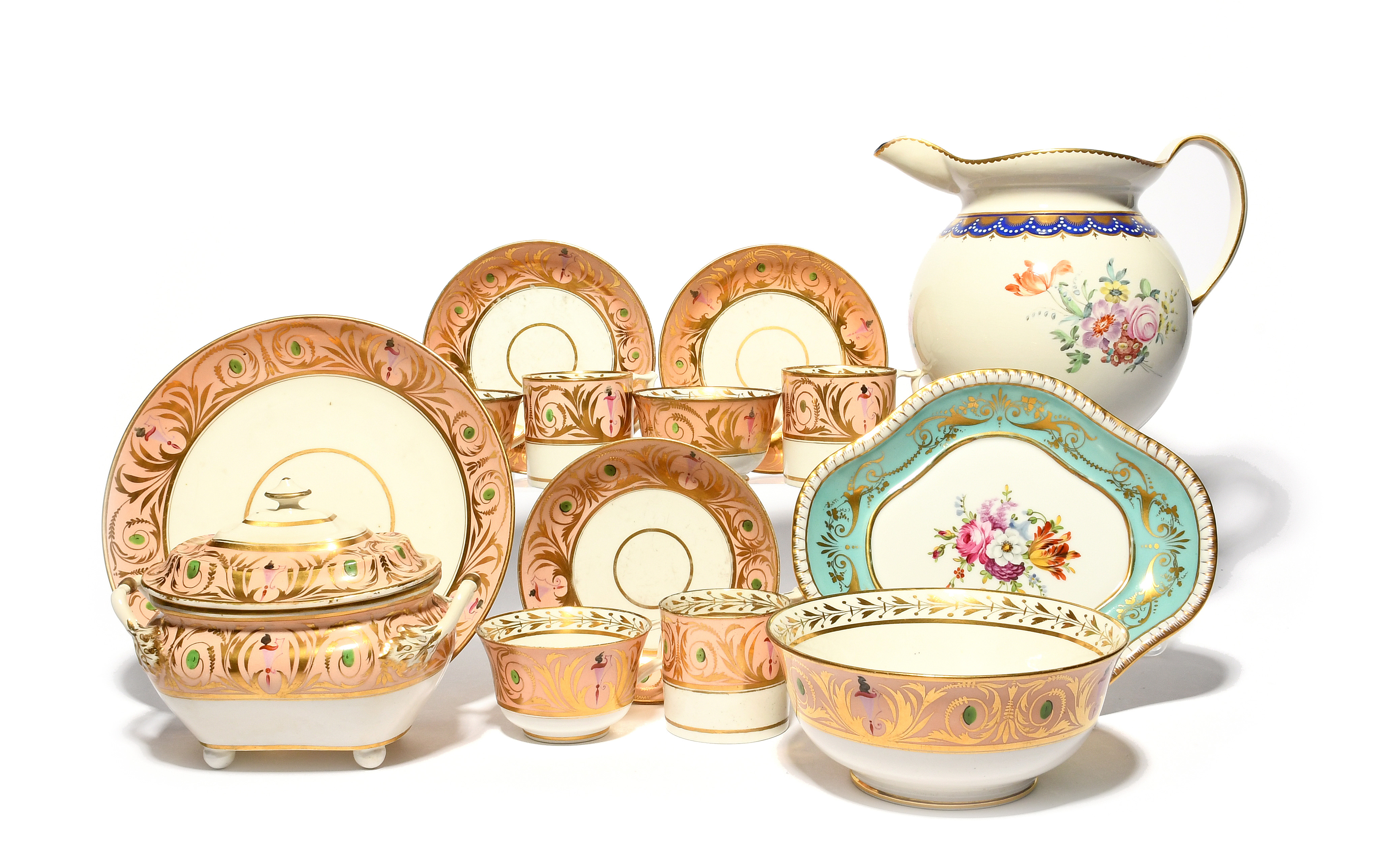 A Derby part tea service, c.1815, decorated with a formal gilt and polychrome foliate border on a salmon pink ground, comprising a sucrier and cover, a slop bowl, a cake plate and three trios, together with a large Derby jug, c.1785, painted with a spray of flowers beneath a blue and gilt rim, puce crowned D mark, and a hard-paste Chelsea-Derby style quatrefoil dish, 21.5cm max. (15)