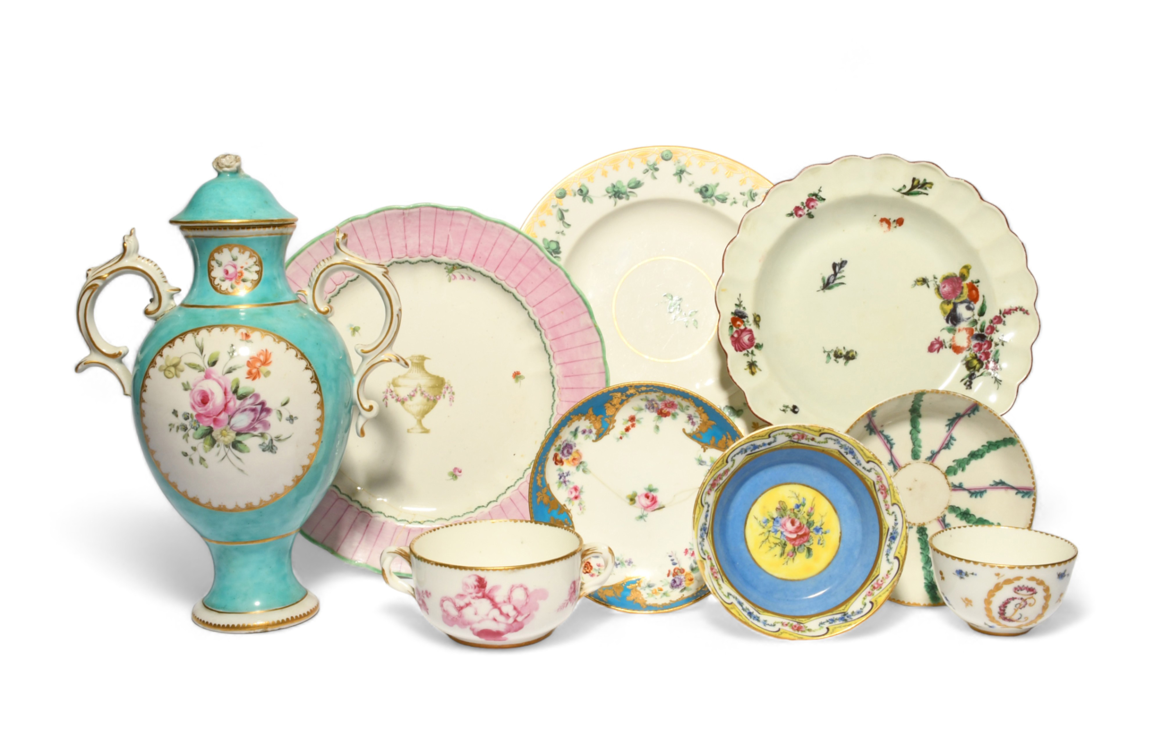 A small study collection of English and French porcelains, 18th century, including a Worcester plate, a Chelsea-Derby vase and cover with flowers on a turquoise ground, a Chelsea-Derby saucer and two plates, a Sèvres teabowl painted with monogrammed initials, a small ecuelle painted with puce putti, and two saucers painted with flowers, 26.3cm max. (10)
