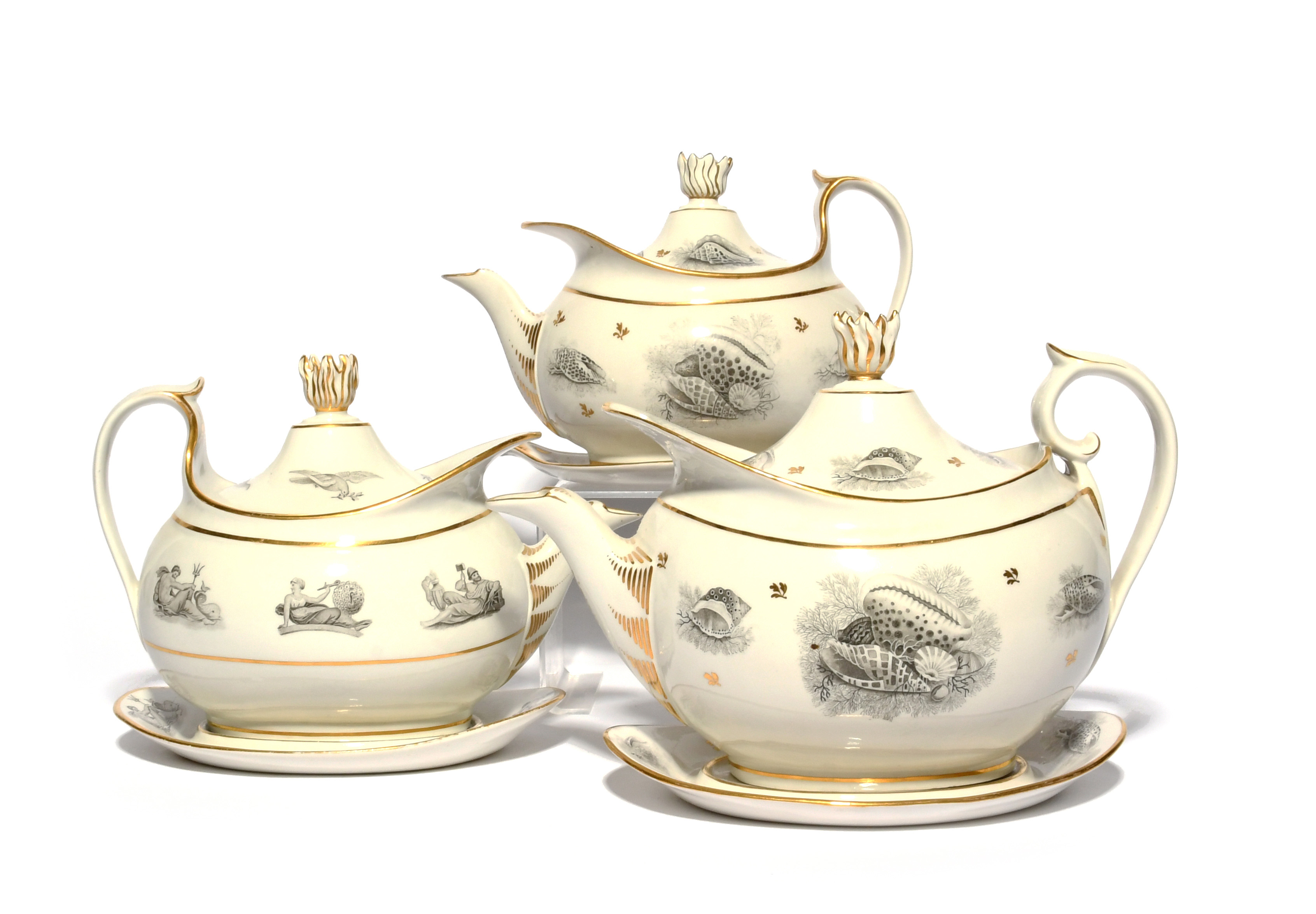 Three Barr Flight and Barr (Worcester) teapots with covers and stands, c.1810, bat printed in black, two with vignettes of shells on a seaweed ground, the other with Classical figures and laurel sprigs, impressed and incised marks, some faults, 25cm max. (9)