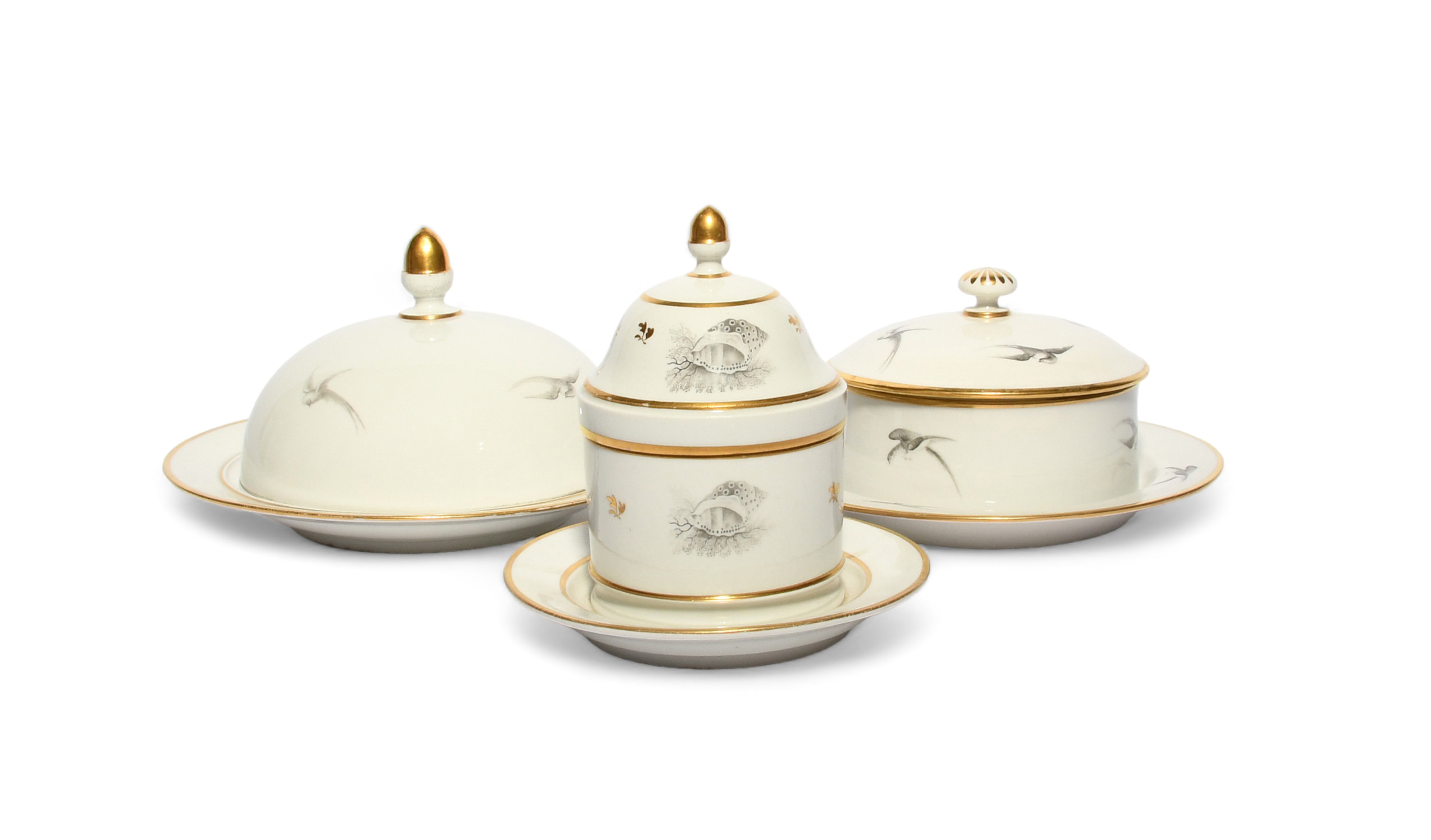 A Barr, Flight and Barr combined breakfast set, c.1810, comprising a muffin dish and cover, a buttertub with cover and stand, printed in black with birds in flight, and a honeypot and cover, printed with shells, impressed marks, 21.3cm max. (7)