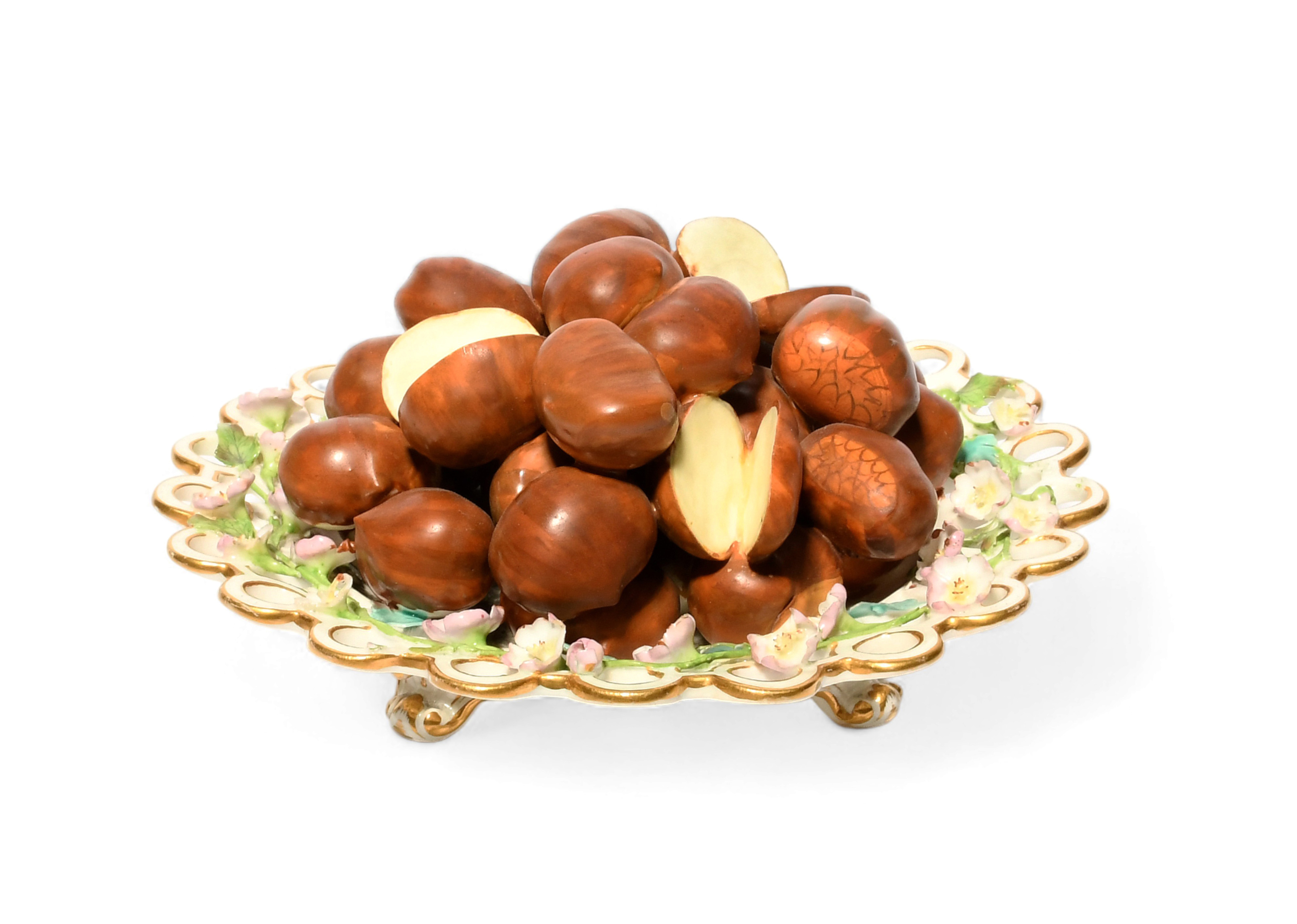 A Minton trompe l'oeil plate, c.1830, the well piled with sweet chestnuts, the spectacle rim applied with a continuous band of pink flowers, raised on four foliate scroll feet with gilt detailing, some retouching to one chestnut, a crack to the underside, 18.5cm.