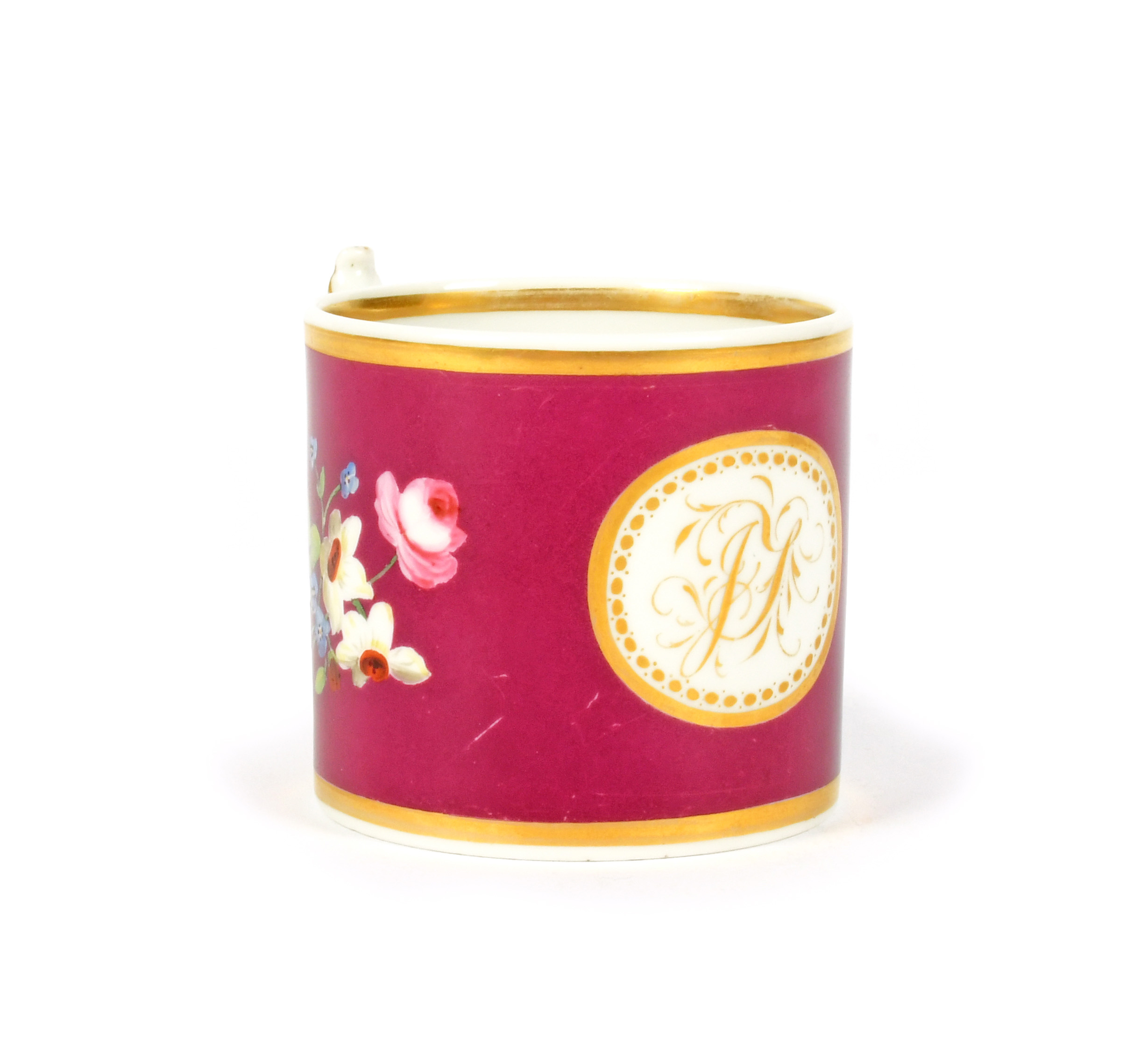 A documentary Flight, Barr and Barr coffee can, dated 1833, gilded with the monogram ‘JT’ reserved on a claret ground with flower sprays, the underside titled in red ‘James Tomlins born February 25th 1833’, 6cm.