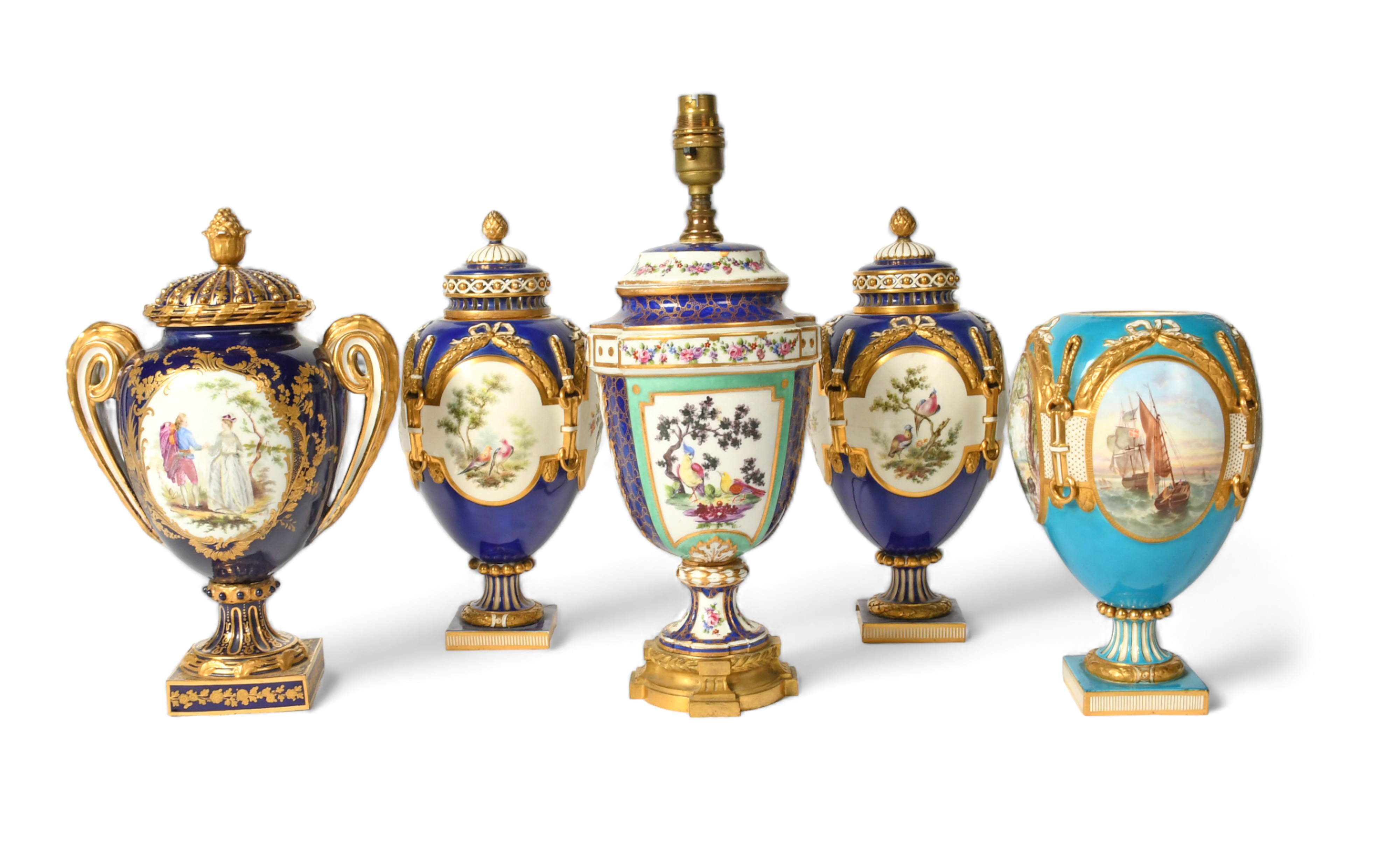 A pair of Minton porcelain vases and covers, 19th century, decorated in the Sèvres style with panels of birds and flowers on a blue ground, a Minton vase of the same shape painted with landscape panels and boats at sea, a two-handled vase and cover painted with a courting couple, and a lamped Sèvres-style vase and cover painted with birds on a blue caillouté ground, damages, 38cm max. (8)