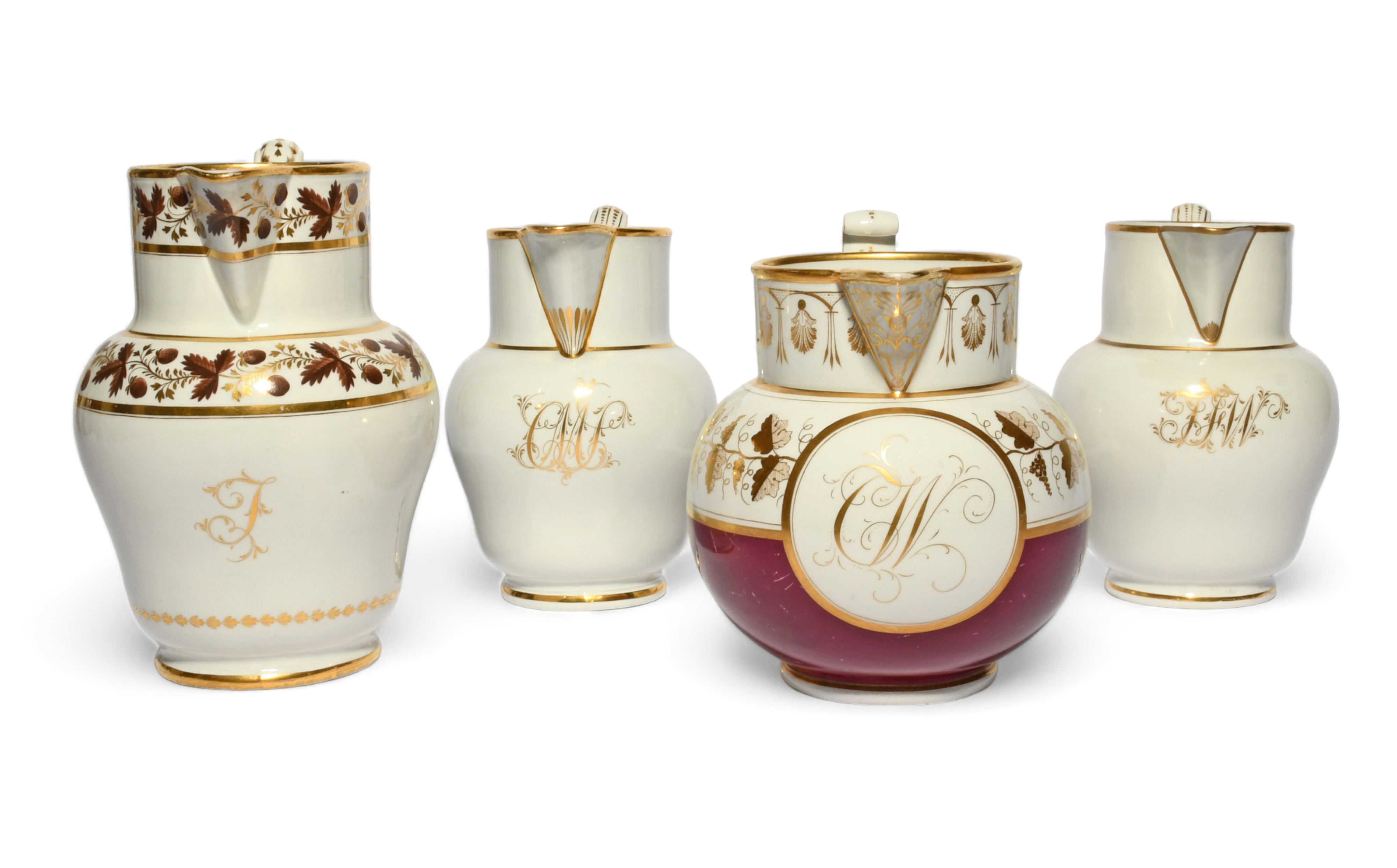 Four Flight and Barr Worcester monogrammed jugs, c.1810-20, a pair simply decorated with gilt initials for 'CMS' and 'JJW', another decorated with the initials 'CW' on a claret ground, the last with the initial 'J' between strawberry bands in brown and gilt, incised and script marks to two, some restoration, 23.3cm max. (4)