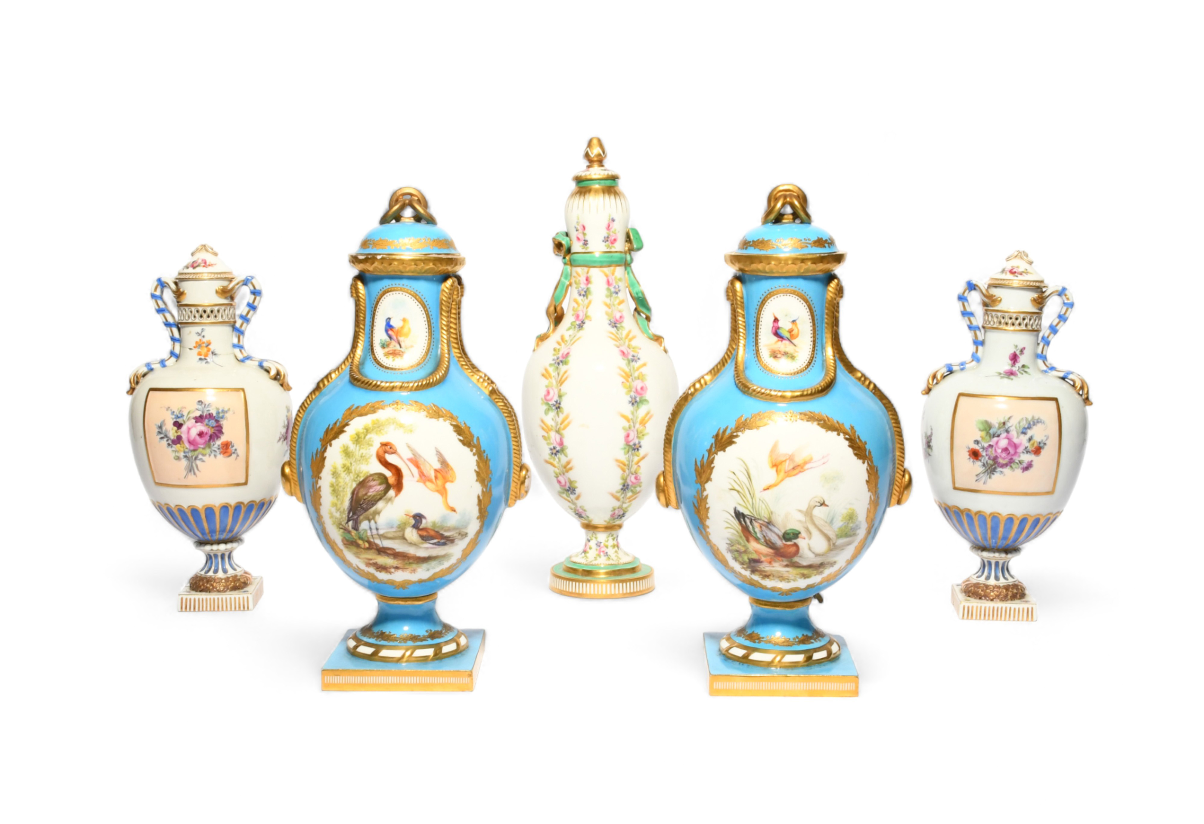 A pair of Coalport vases and covers, 19th century, in the Sèvres manner, painted with panels of exotic and aquatic birds within gilt panels on a turquoise ground, a pair of Continental porcelain vases and covers in the same shape, painted with panels of flowers, and a tall English porcelain vase and cover of hexafoil shape, painted with stripes of rose, cornflower and barley, the handles formed as ribbons, some damages and restoration, 31.5cm max. (10)