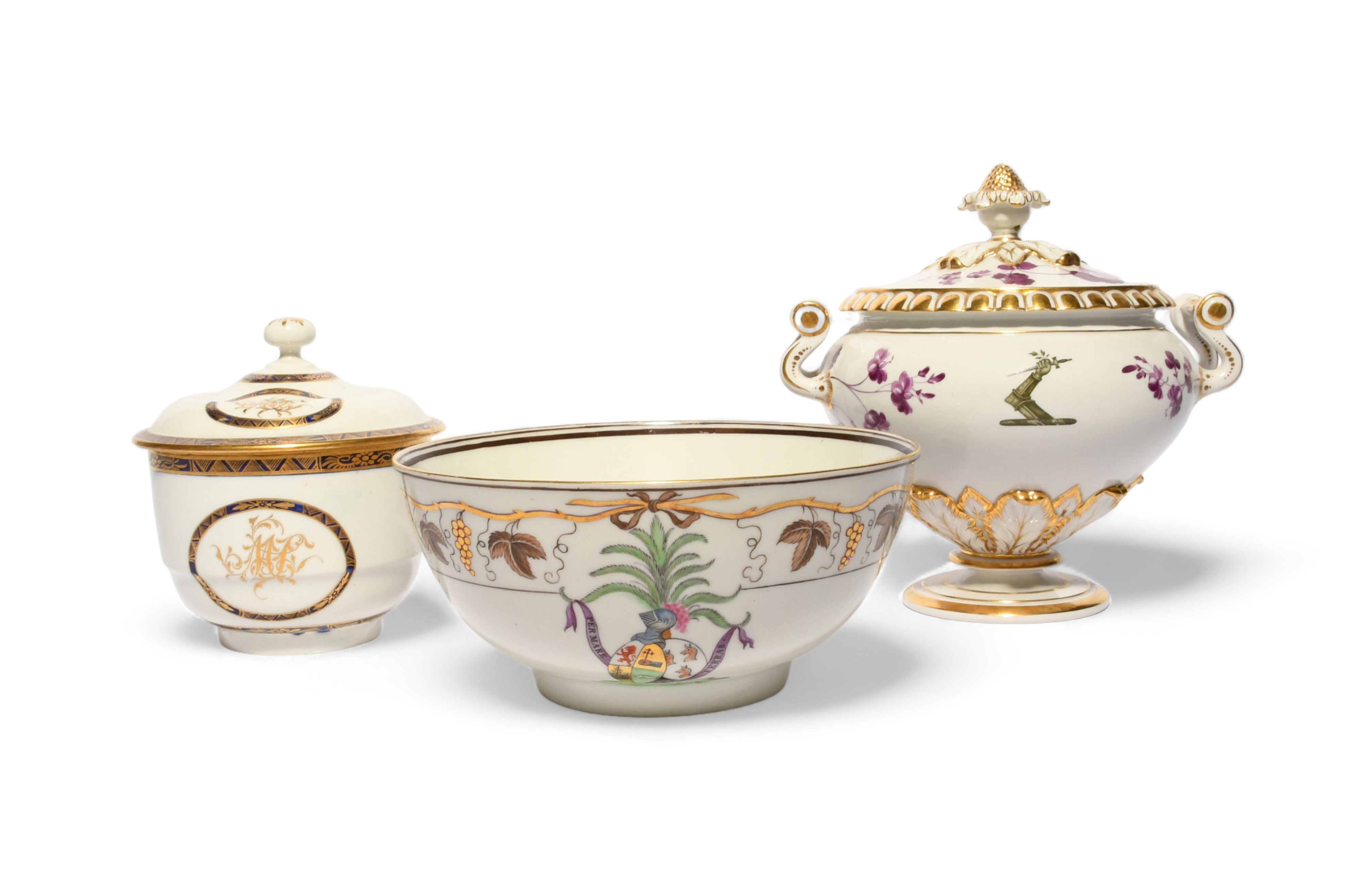 A Barr armorial slop bowl, c.1800, decorated with the arms of Macdonald accolée Forbes, a sauce tureen and cover with the crest of an arm embowed between purple flower sprays, and a Flight sugar bowl and cover decorated with a gilt monogram 'MS', 17cm max. (5)