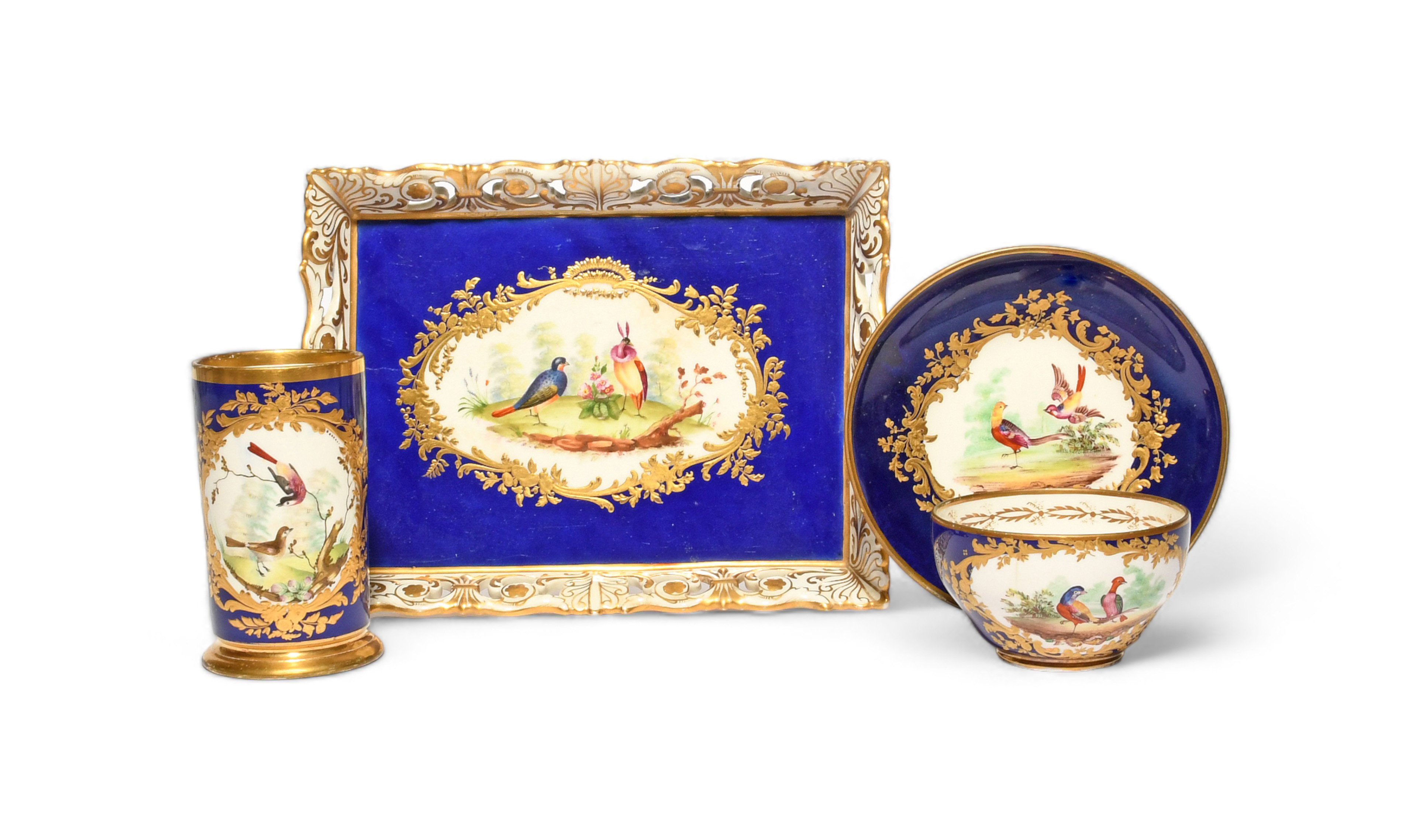 A Bloor Derby tray in the Sèvres style, 1st half 19th century, painted with a panel of birds reserved on a royal blue ground, with an elaborate pierced rim, a Sèvres-style cylindrical spill vase and a teacup and saucer with similar decoration, pseudo interlaced LL marks to the latter, some faults, 23.8cm max. (4)