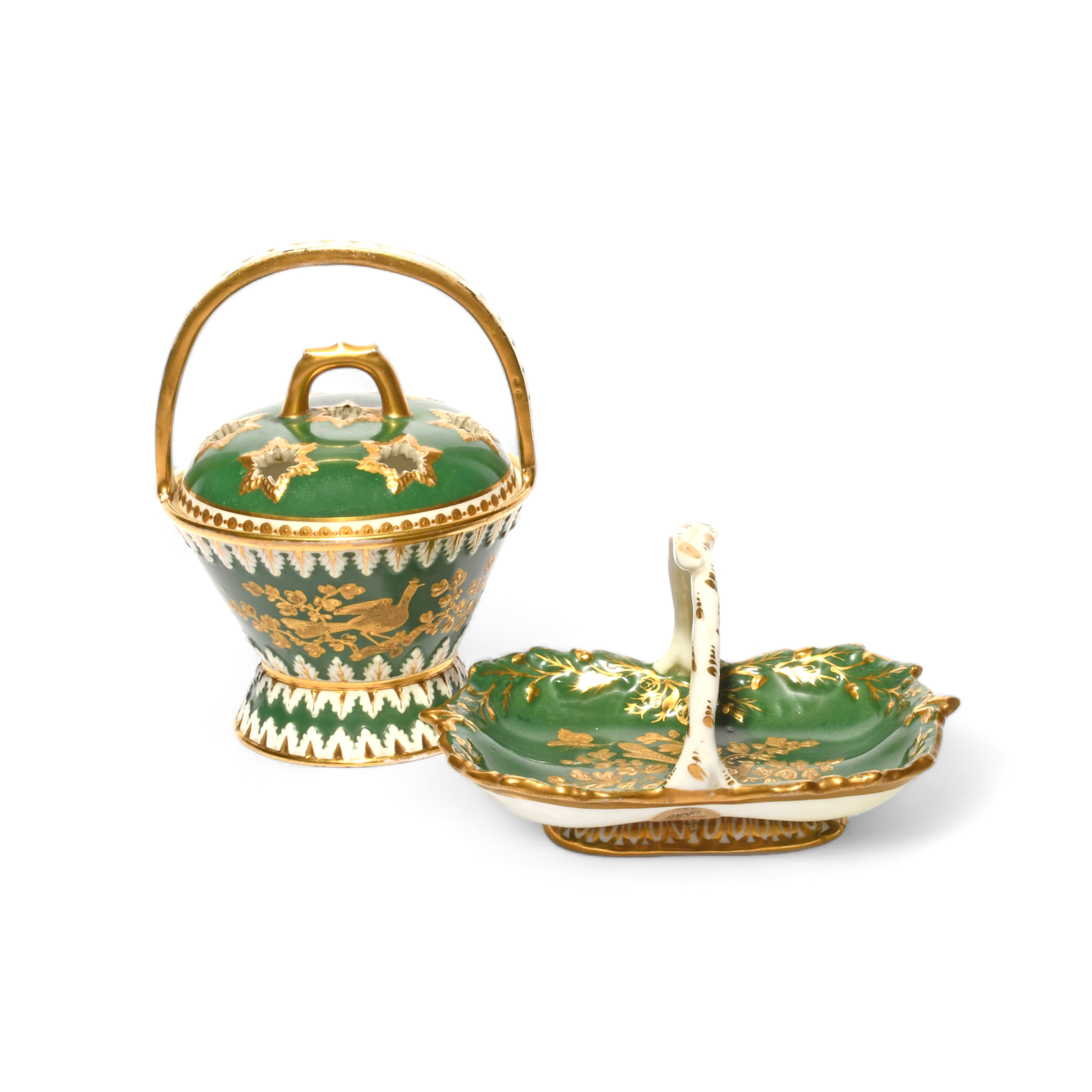 A miniature Spode pot pourri jar and cover and a basket, c.1820, decorated in pattern 3945 with raised gilt birds and flowering branches on a green ground, iron red factory marks, some restoration to the basket, 10.3cm max. (3)