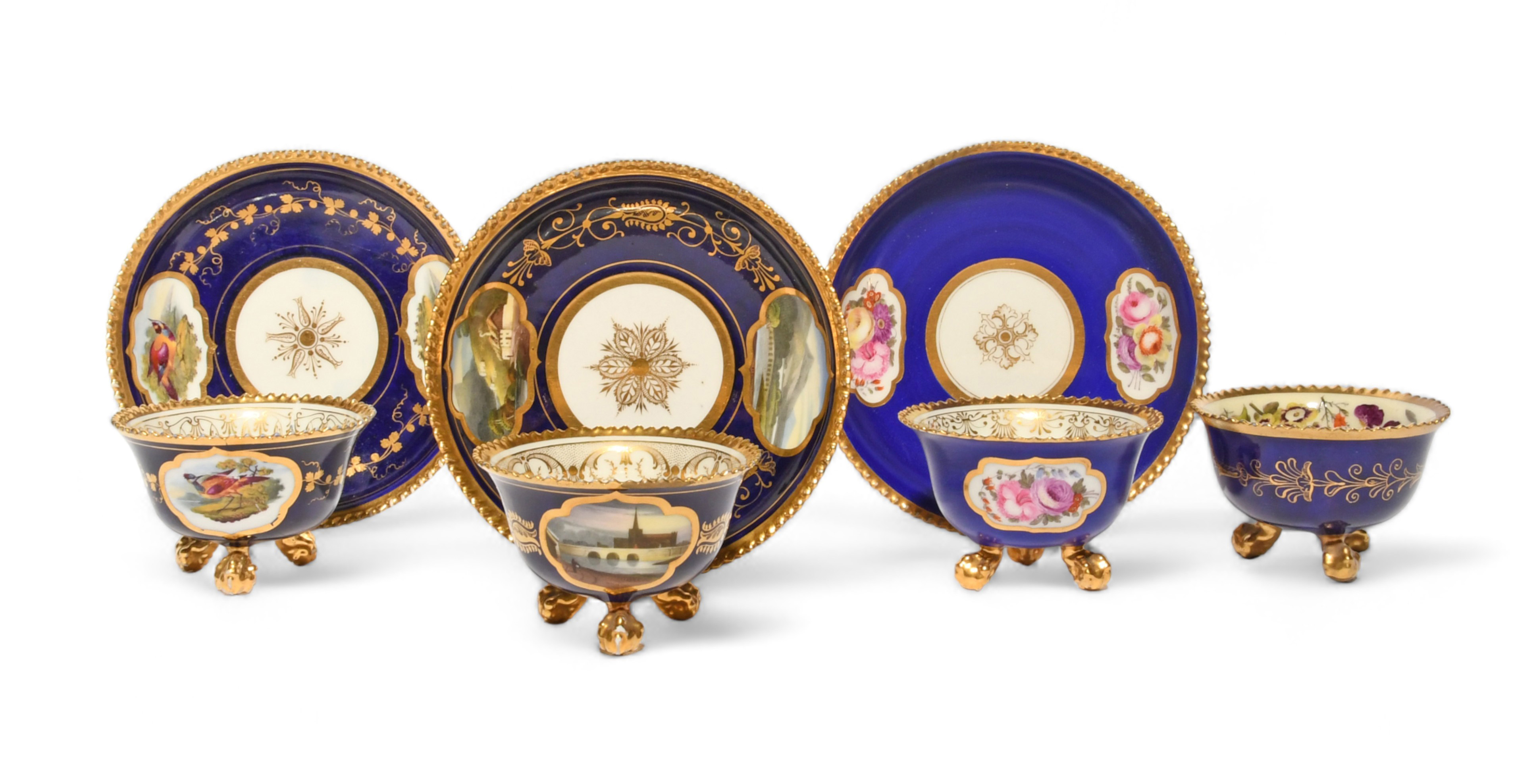 Four Flight, Barr and Barr toy-sized cabinet teabowls and three stands, c.1825, variously decorated with birds, flowers and landscapes reserved on blue ground, the teabowls raised on paw feet, printed marks to the stands, some damages, 10.7cm. (7)