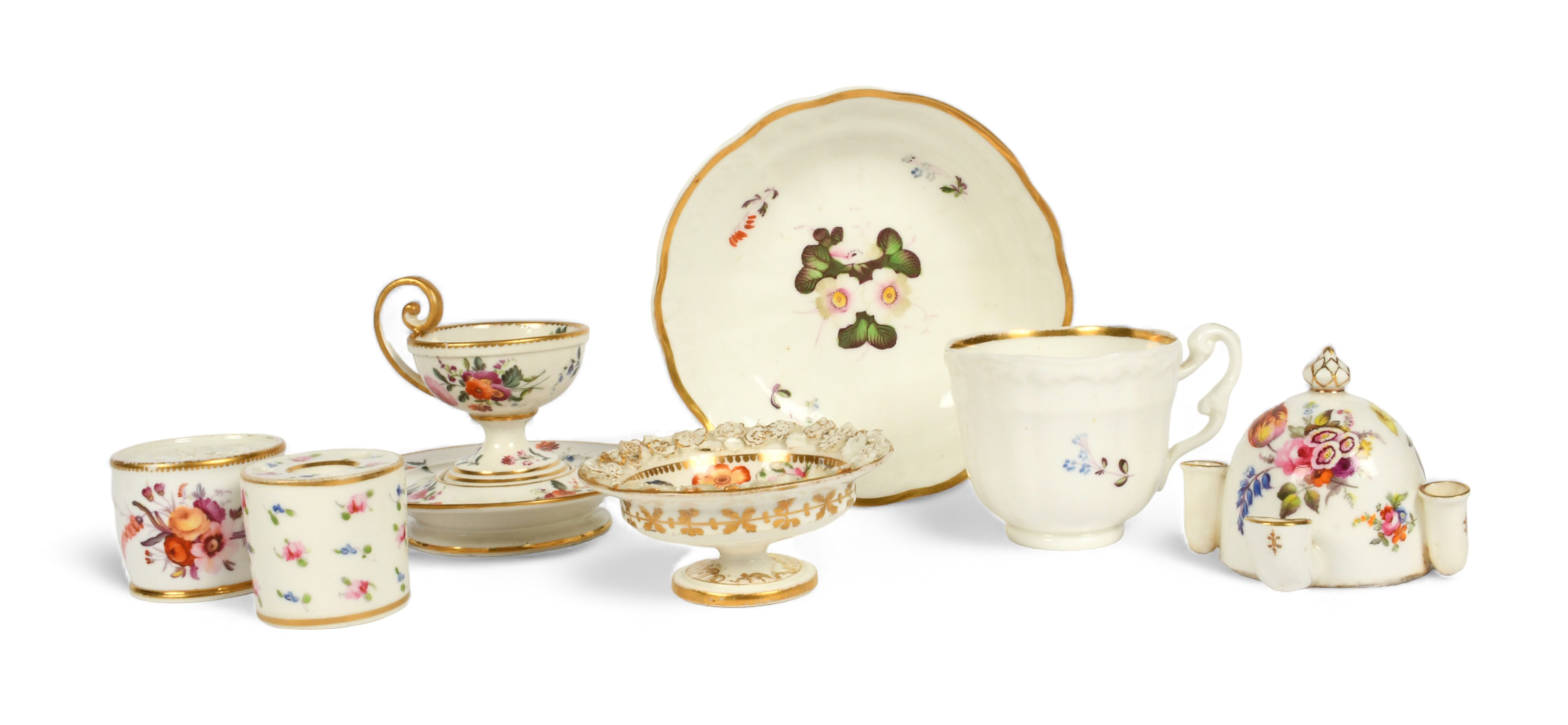 A Swansea cabinet cup and stand, c.1818, raised on a circular foot with a curved handle, a pounce pot, a small inkwell, a small tazza or pin tray applied with flowers to the rim, a Nantgarw-style cup and saucer, and a cover for an incense burner, all painted with European flowers, 14.7cm max. (8)