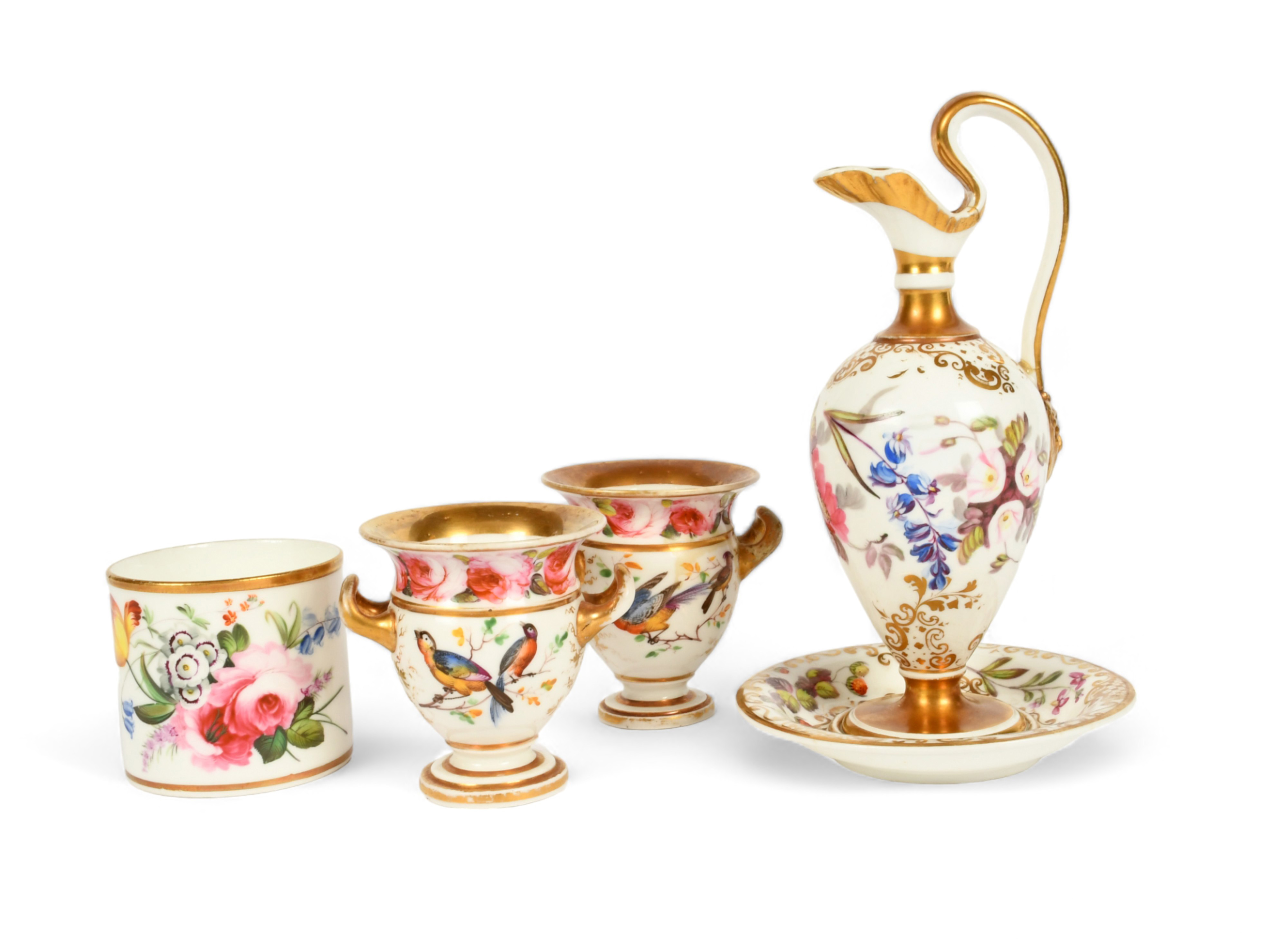 A Swansea 'Pembroke' ewer and stand, c.1818-20, painted with flowers, a pair of miniature Swansea-style vases painted with birds, and a small toilet pot painted with flowers, some restoration, 14.7cm max. (5)