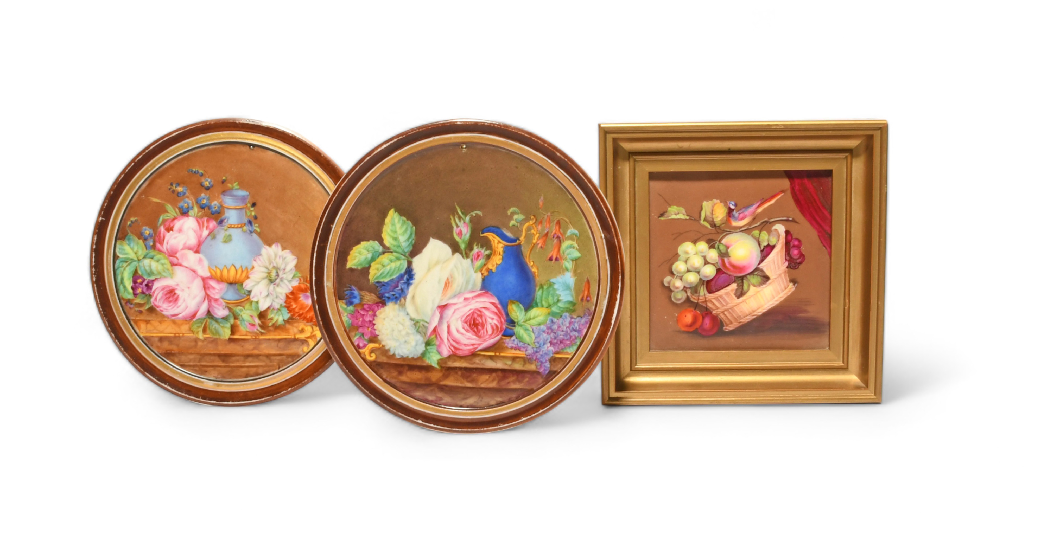 A pair of English porcelain circular plaques, 19th century, painted with ewers amidst large rose, lilac and dahlia flowers, resting on decorative table tops, and an English porcelain square plaque painted with a colourful bird alighted on a fruiting branch on a tilted basket filled with grapes and other fruits, in a later giltwood frame, 13.3cm max. (3)