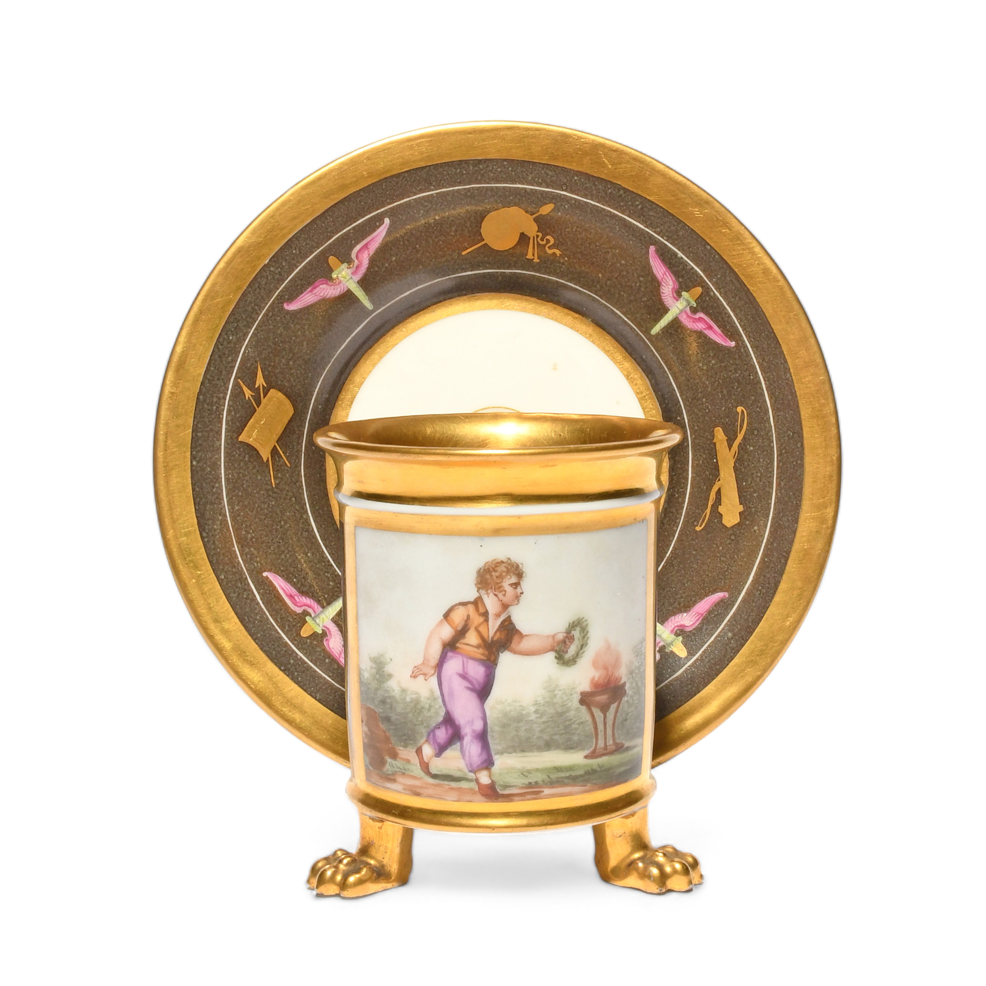 A Paris porcelain cabinet cup and stand, early 19th century, the cup painted with a figure placing a wreath on a burning censer, the sides with gilt victory motifs, raised on three paw feet, the saucer with winged torch motifs and other symbols on a dark brown ground, 13.8cm. (2)
