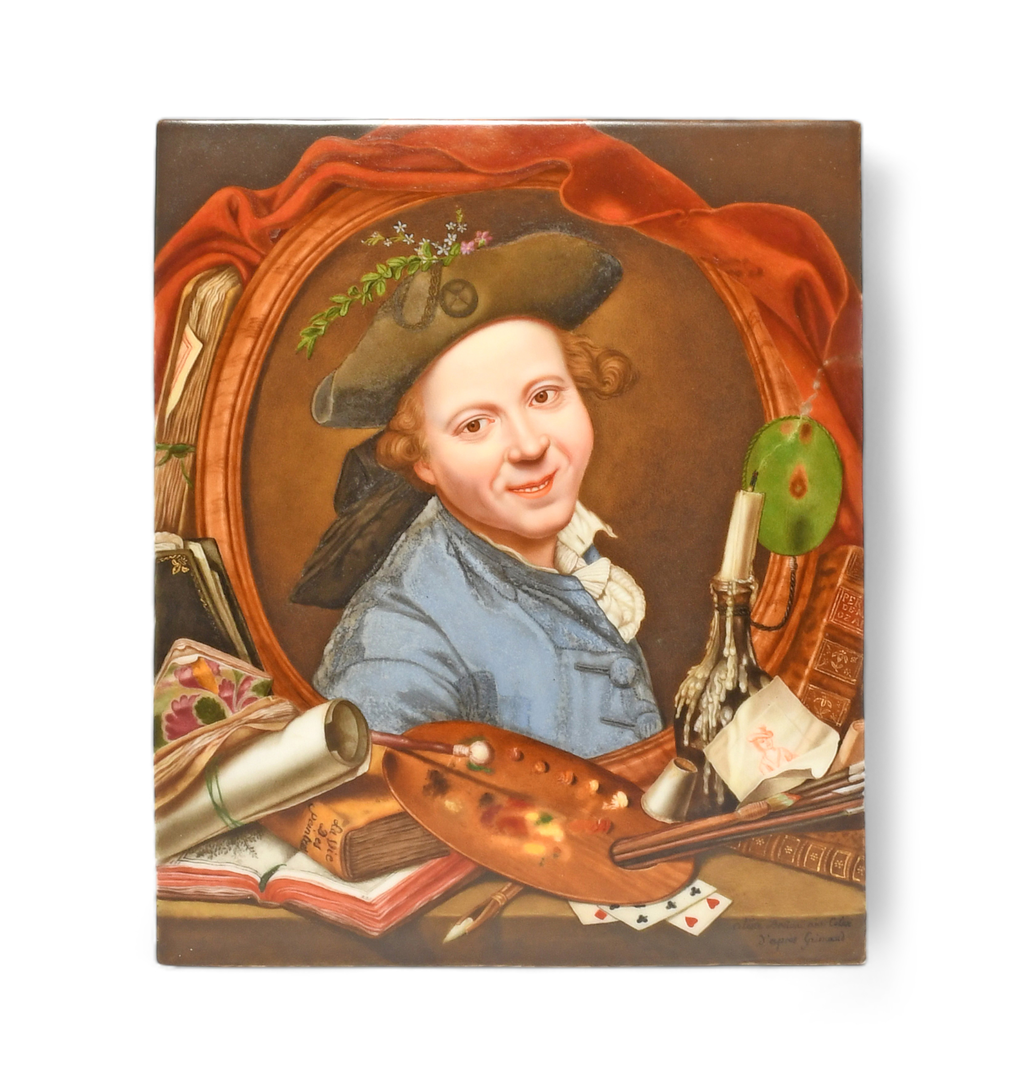 A Paris porcelain rectangular plaque, 19th century, painted by Celeste Breton (née Colen) with the portrait of a smiling man within a wooden frame, surrounded by an artist's accoutrements, various books and playing cards, signed bottom right 'Celeste Breton née Colen d'apres Grimaud', signed again to the reverse stating that Breton was a pupil of Madame Jaquotot, 24.1cm x 19.6cm.