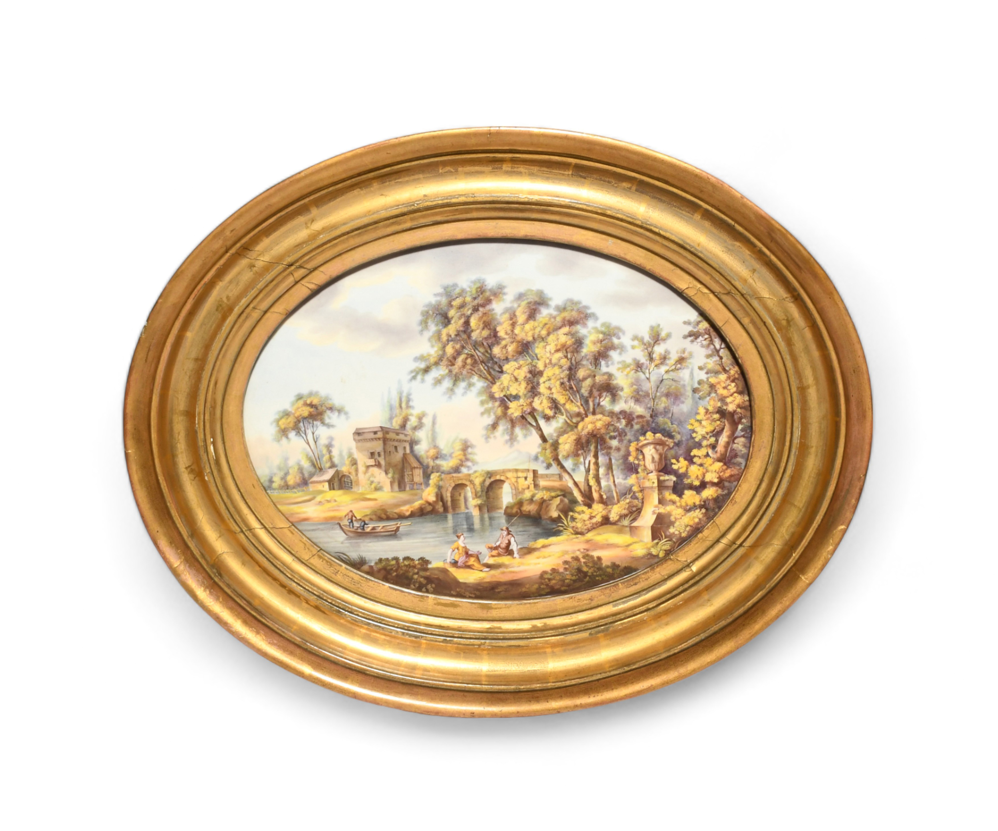 A large oval porcelain plaque, 19th century, painted with two figures reclining on a river bank, two further figures fishing with a net from a boat, an arched bridge leading to a building on the opposite bank, mounted in a gilt wood frame, the plaque 32.5cm, 35.5cm overall.