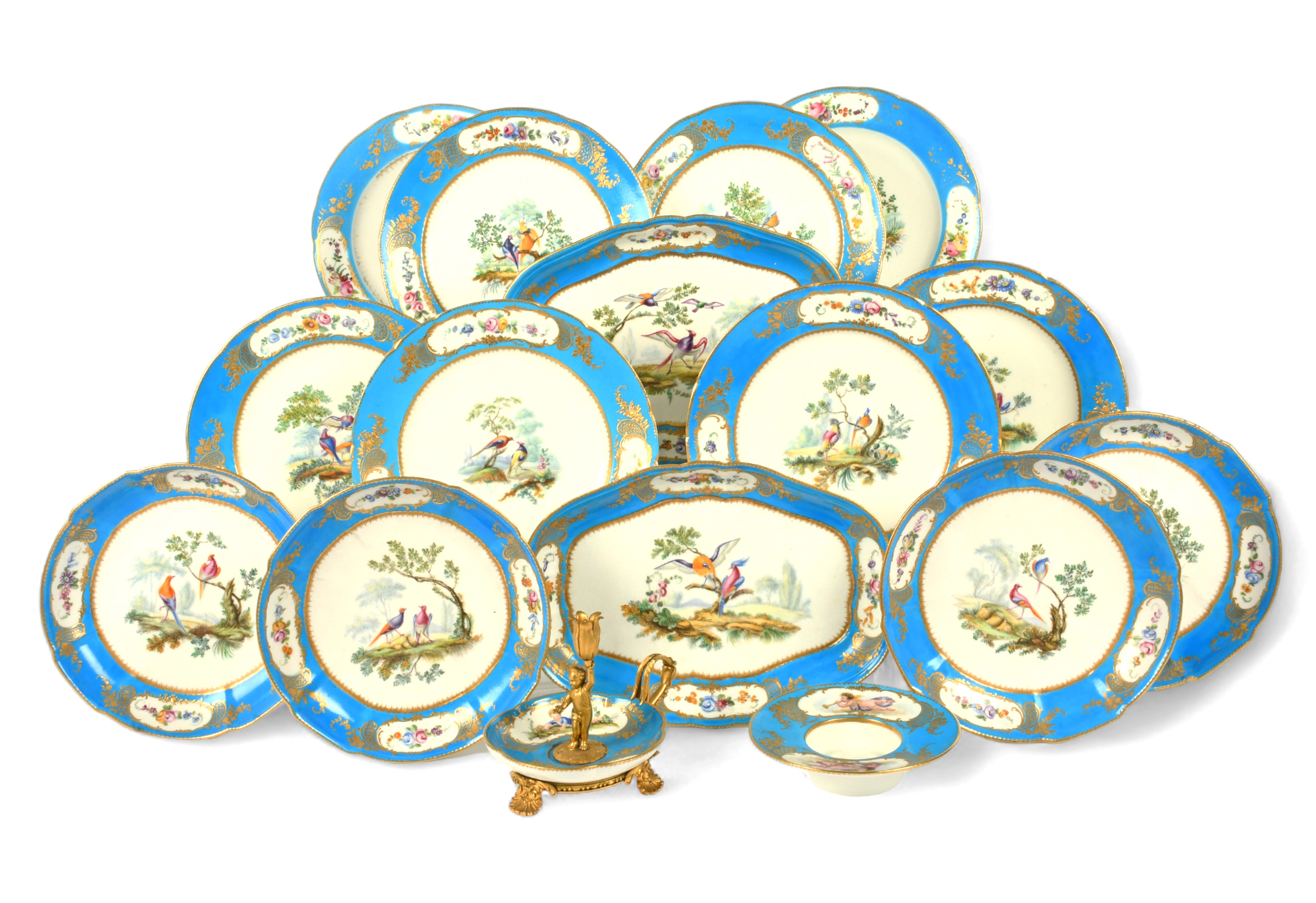 Four Sèvres-style circular dishes (compotiers rond) and eight plates, probably late 18th century, painted with colourful birds to the wells, the rims with panels of flowers within gilt trellis borders on a bleu celeste ground, together with two oval dishes in the same pattern, and two Sèvres saucers, one with ormolu mounts to form a chamberstick, various marks, 29.5cm max. (16)