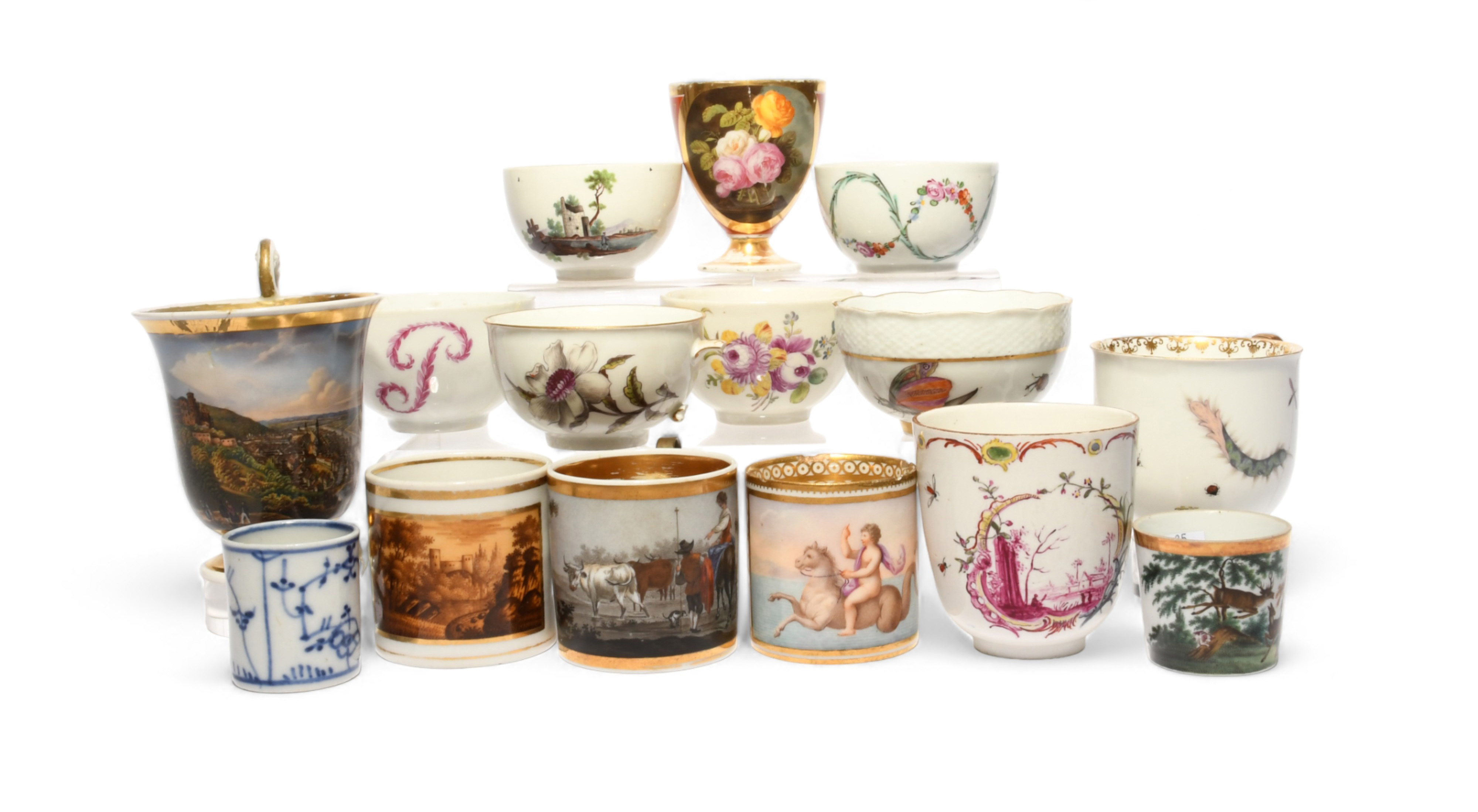 A study collection of Continental porcelain cups and teabowls, 18th and early 19th century, including Höchst, Meissen, Berlin, Wegely and Paris, variously decorated with flowers, landscapes, animals and insects, damages, 11.3cm max. (15)