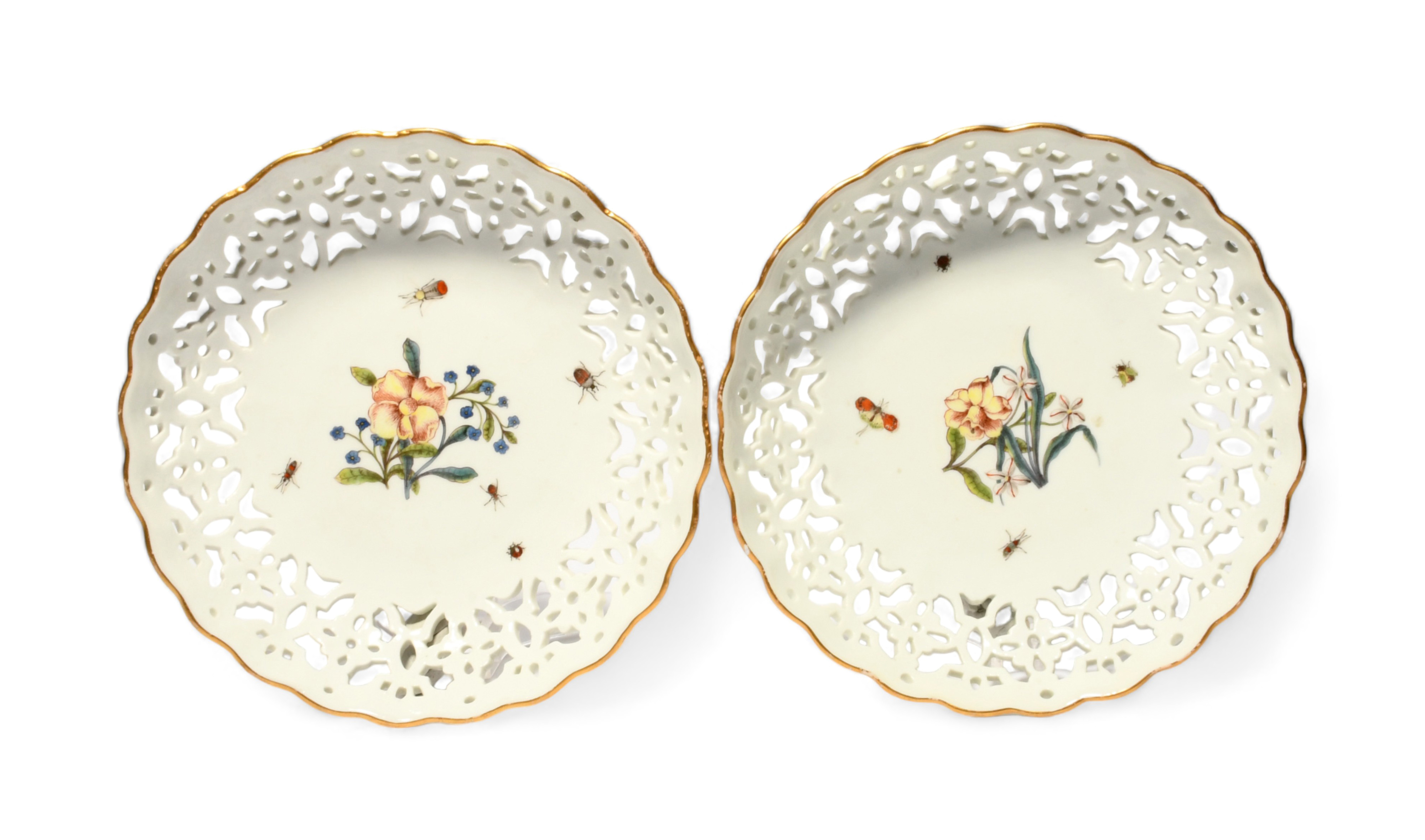 A pair of Meisen reticulated dishes, mid 18th century, the circular forms painted to the wells with