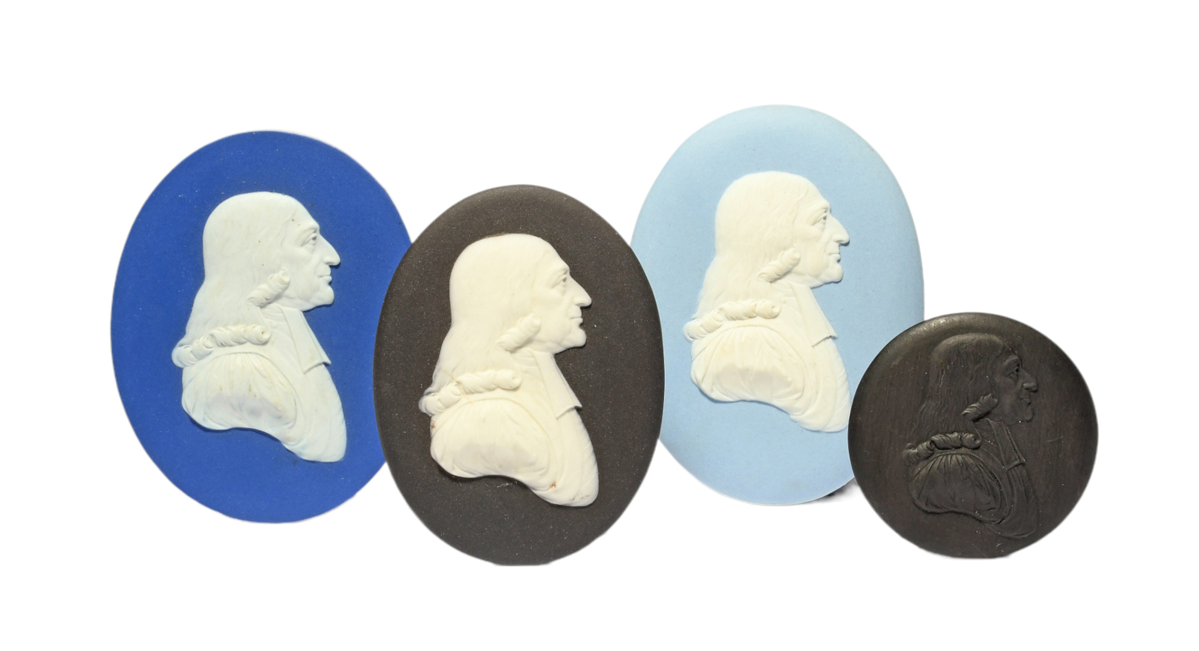 Four Wedgwood portrait plaques, 19th century, three Jasperware and modelled with a profile portrait of John Wesley, on blue and black grounds, the last black basalt with the same portrait, impressed marks, 10.4cm max. (4)