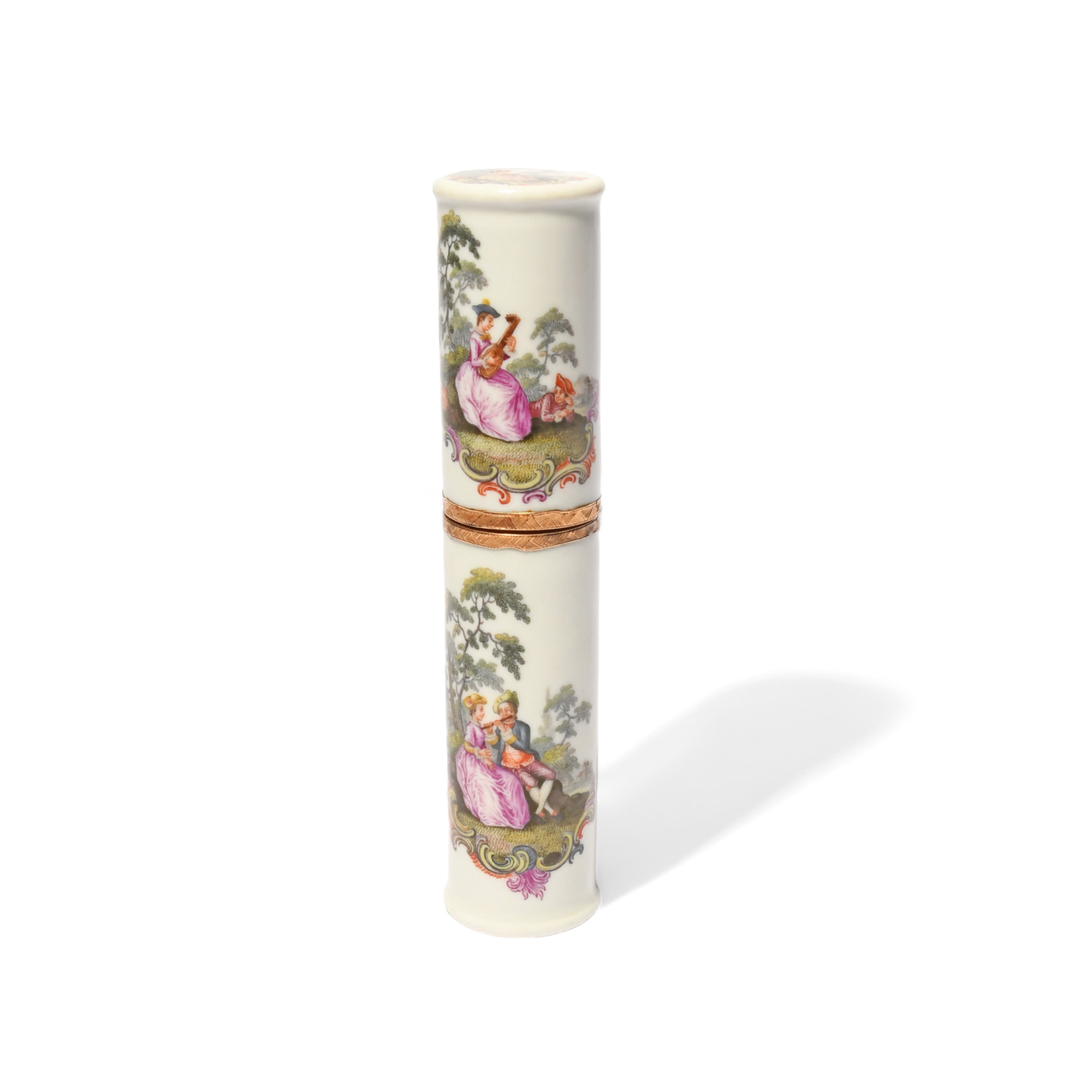 A Meissen etui or bodkin case, c.1760, the wide cylindrical form painted with four scenes of courting couples in pastoral landscapes above rococo scrolls, with chased gilt metal mounts, 12cm.