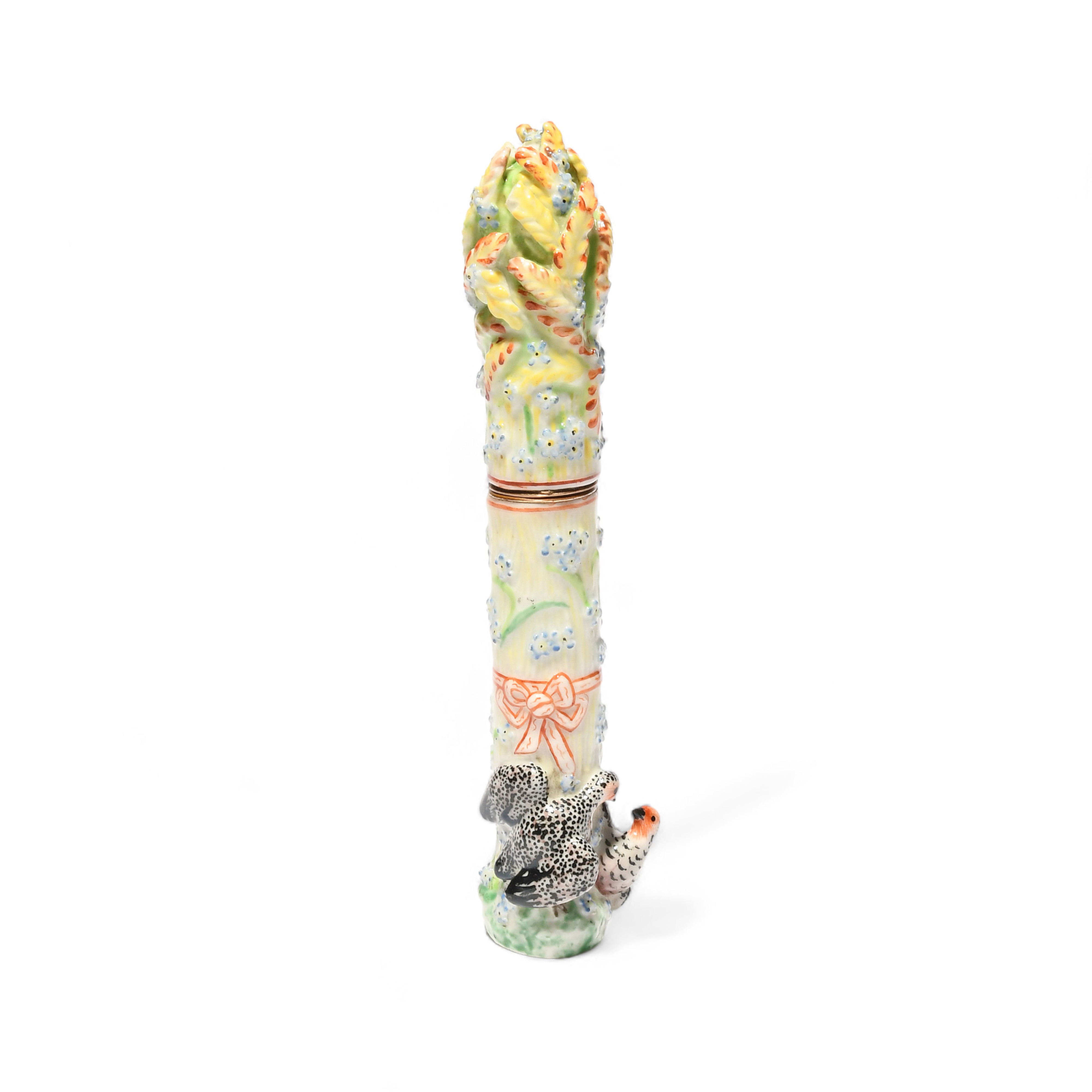 A Chelsea etui or bodkin case, c.1760, modelled as a sheaf of corn bundled with small blue flowers, tied with red-edged ribbons, a pair of game birds modelled at the base, 11.6cm.