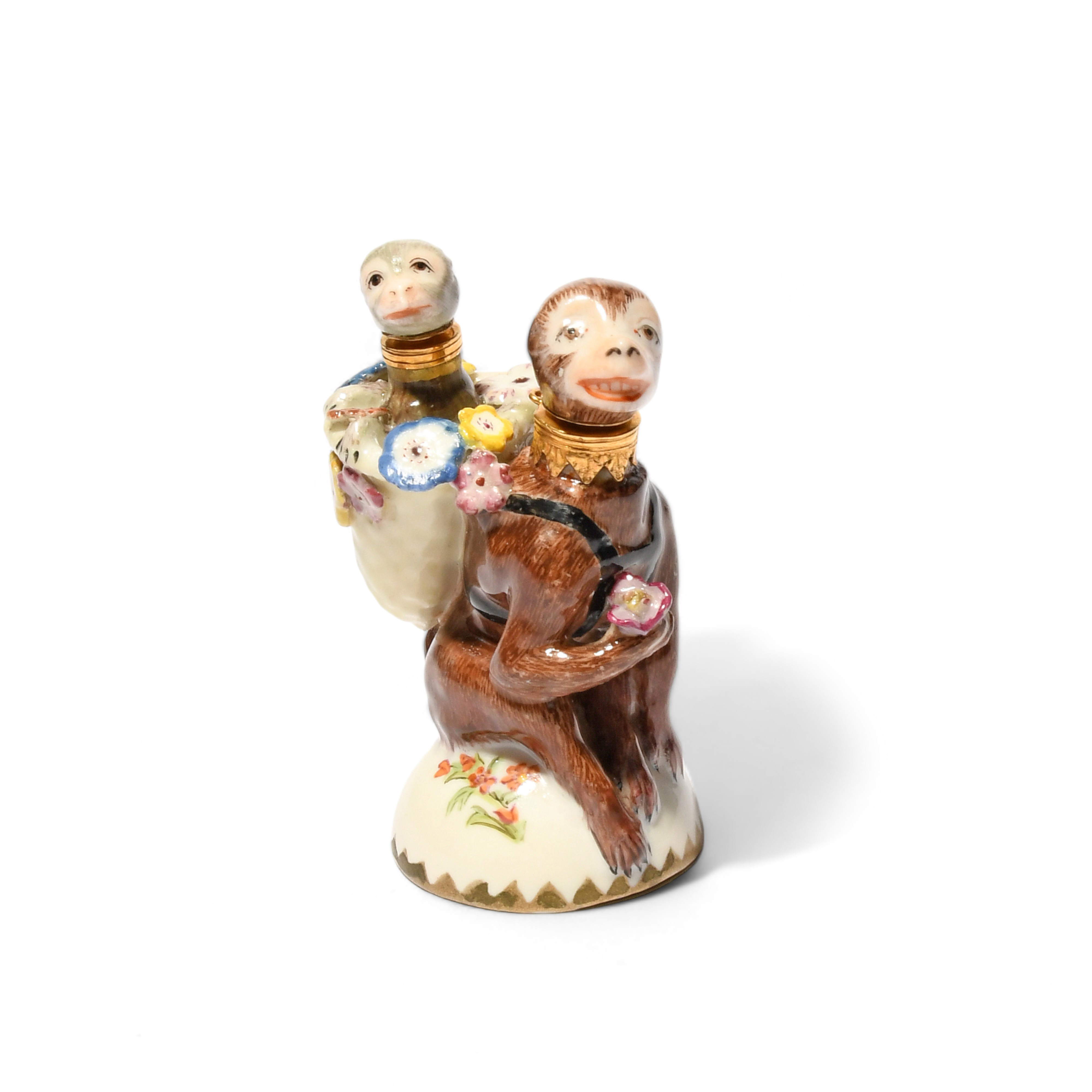 A rare Chelsea double scent bottle, c.1755, modelled as a brown monkey crouched on a domed base painted with flowers, holding a flower in her right paw, carrying a baby monkey in a basket on her back, both heads forming the stoppers, some good restoration, 6.5cm.