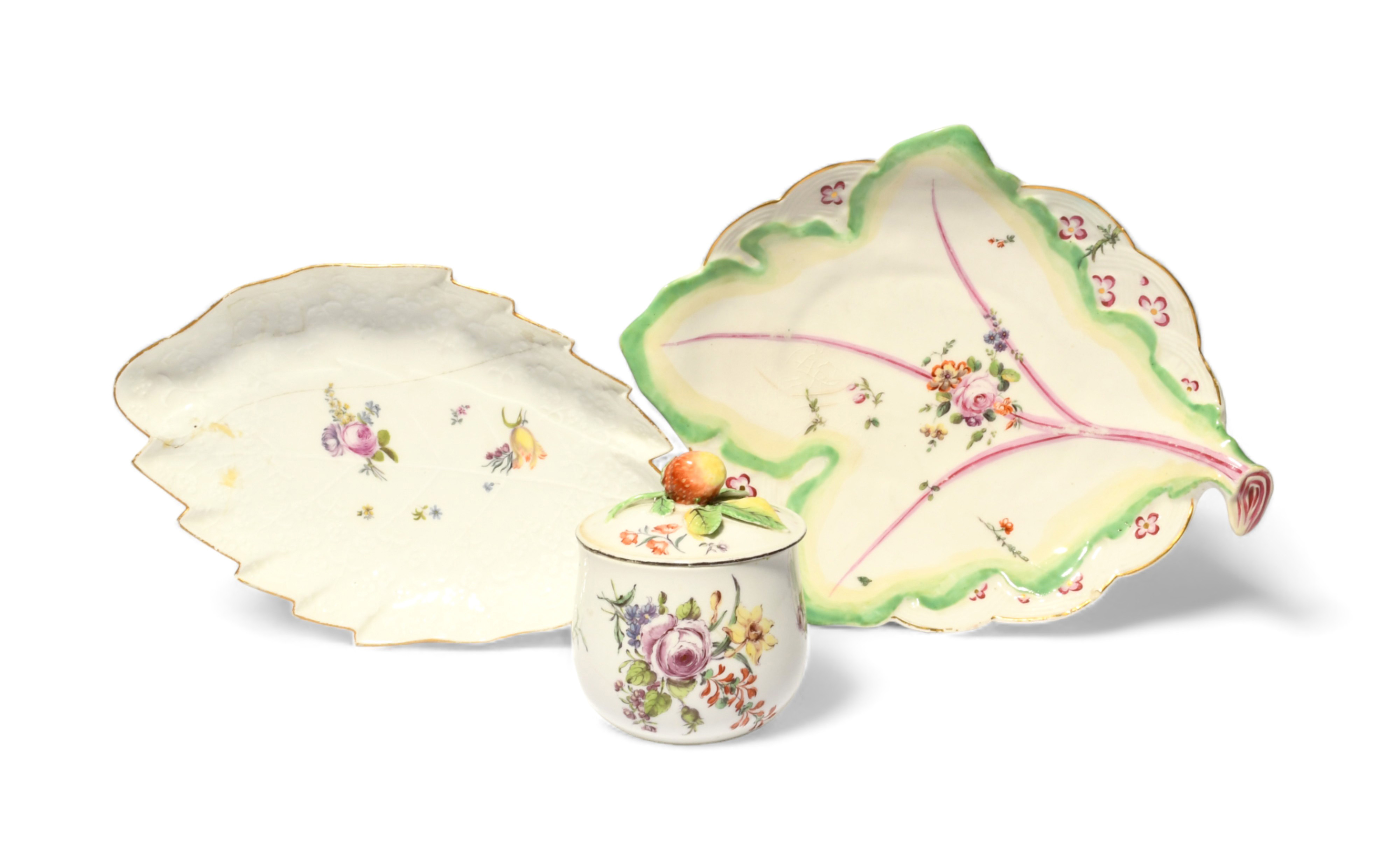 A Chelsea sucrier and cover, c.1755, finely painted with flowers, the cover with a strawberry finial, together with a Derby leaf dish painted with flower sprays, and a Meissen double-leaf dish moulded and painted with flowers, some damages and repairs, 28cm max. (4)