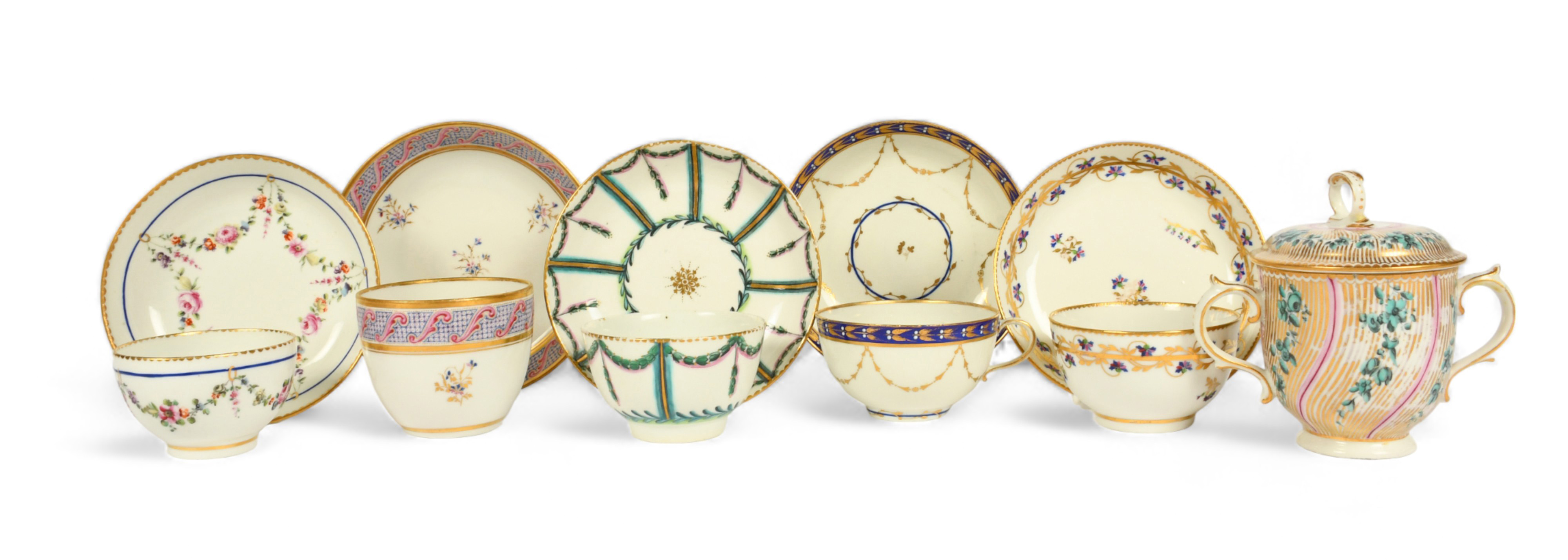 A group of early Derby and Chelsea-Derby teawares, c.1770-90, including four teabowls and saucers decorated with flower and leaf garlands, cornflower sprigs and a Sèvres-style design of pink S scrolls on a trellis band, a chocolate cup and cover with green camaieu flowers on a striped gilt ground, and a teacup and saucer with gilt leaves and white jewelling, various marks, some faults, 13.7cm max. (12)