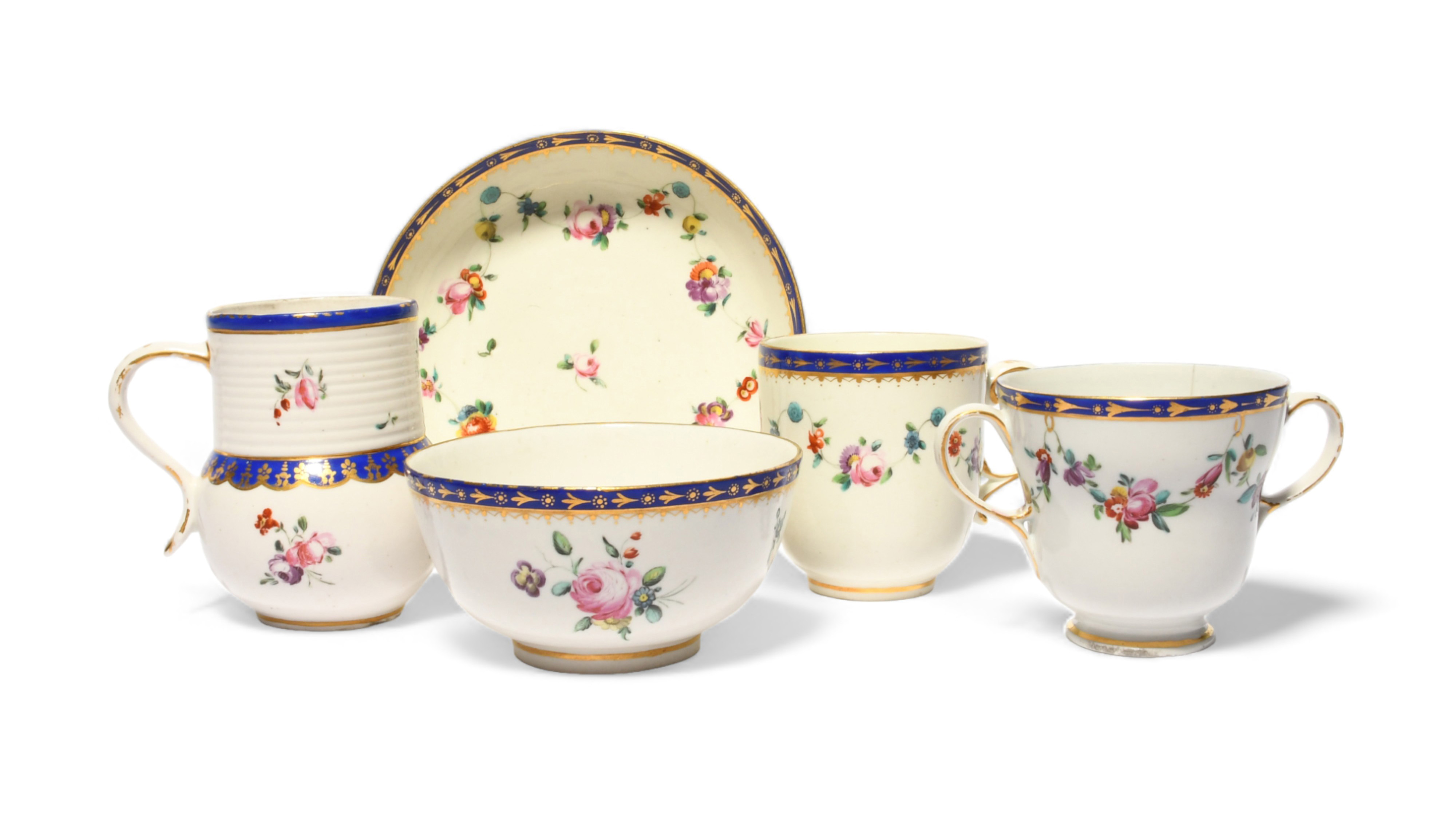A group of Chelsea-Derby teawares, c.1780, including a thistle-shaped mug, a two-handled cup, a breakfast coffee cup and saucer and a small bowl, all painted with sprays or garlands of flowers, the rims with narrow bands of gilt designs on a blue ground, gilt anchor and D marks or blue crowned D marks, 15.7cm max. (5)