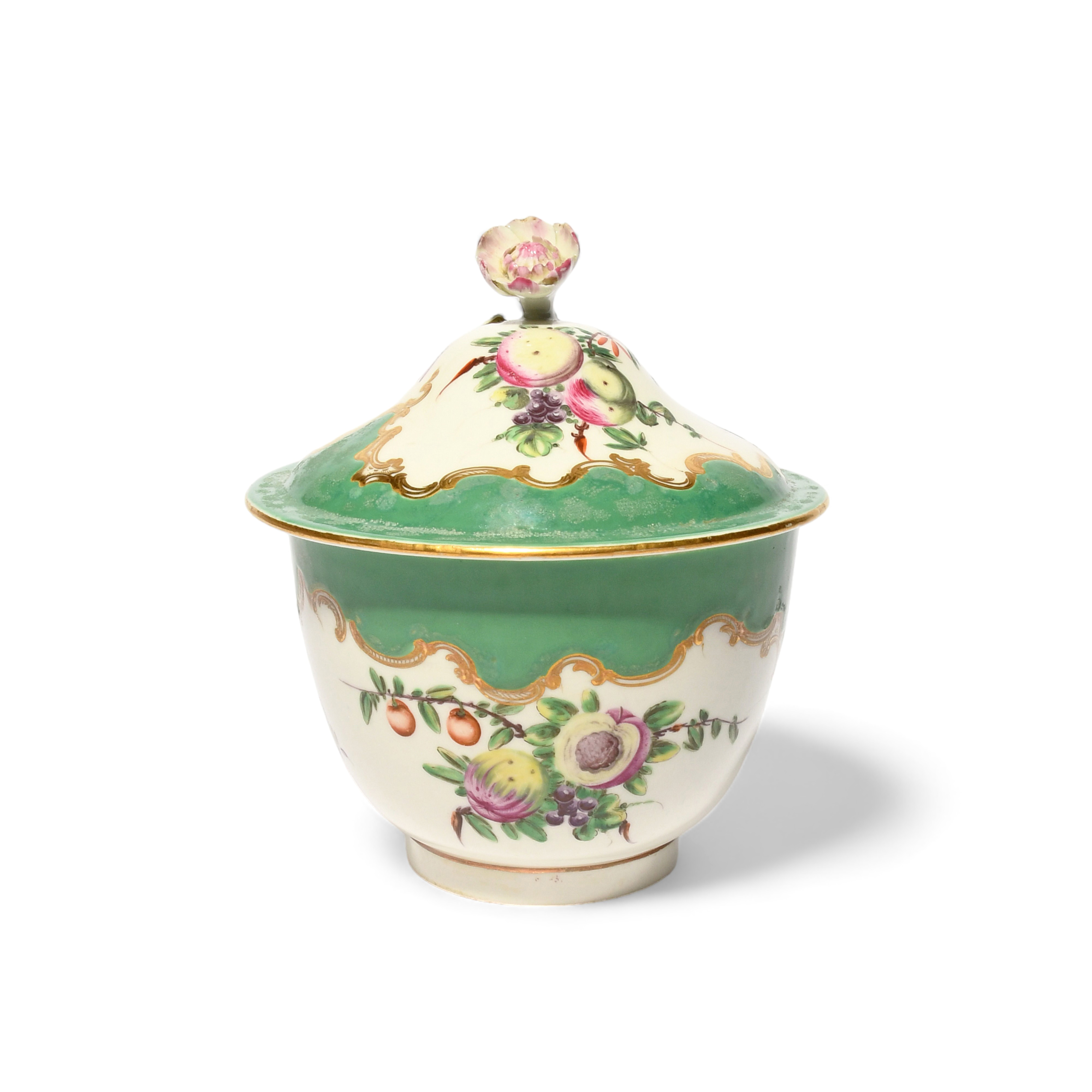 A Worcester sucrier and cover, c.1770, painted with spotted fruits reserved on an apple green ground, the finial modelled as a flower head, the ground possibly later, 13.5cm. (2)