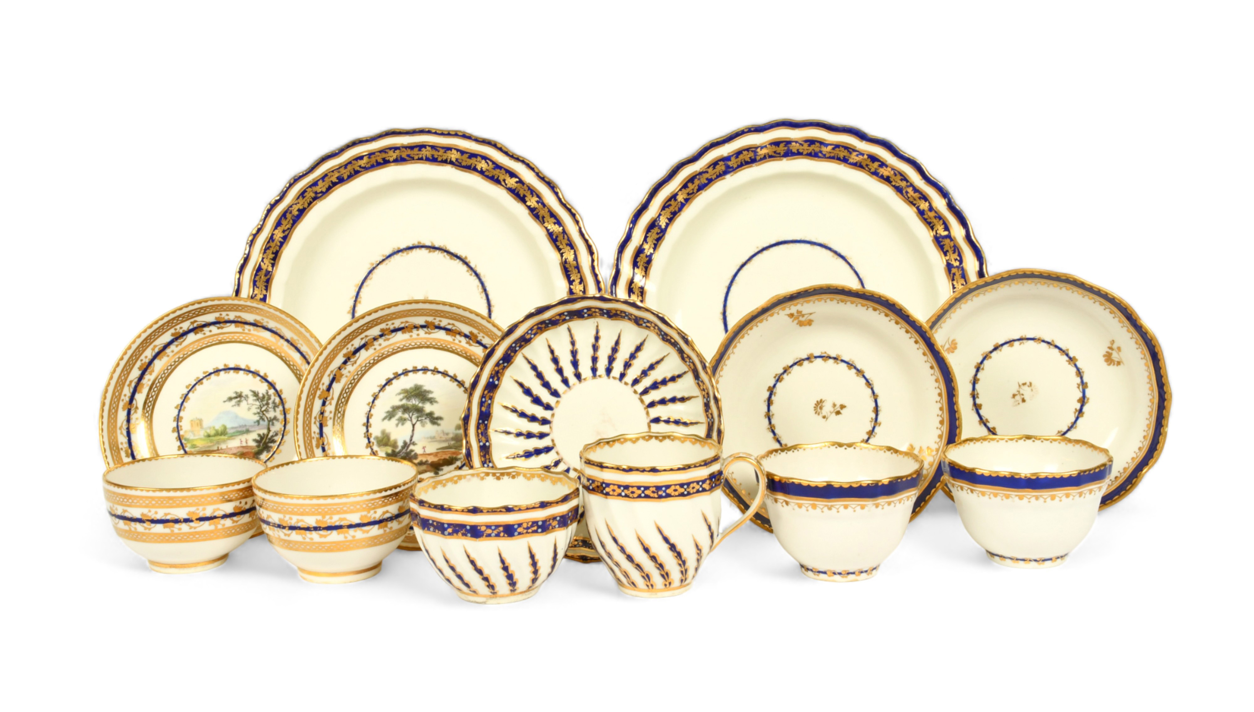 A group of Derby teawares, c.1790, including a pair of teabowls and saucers painted probably by Zachariah Boreman with small figures in landscapes, a pair of moulded teabowls and saucers of slight ogee form, and a spiral moulded trio of coffee cup, teabowls and saucer with blue and gilt leaf frond design, together with a pair of cake plates with blue and gilt borders, puce marks, a little gilt wear, 21.5cm max. (13)