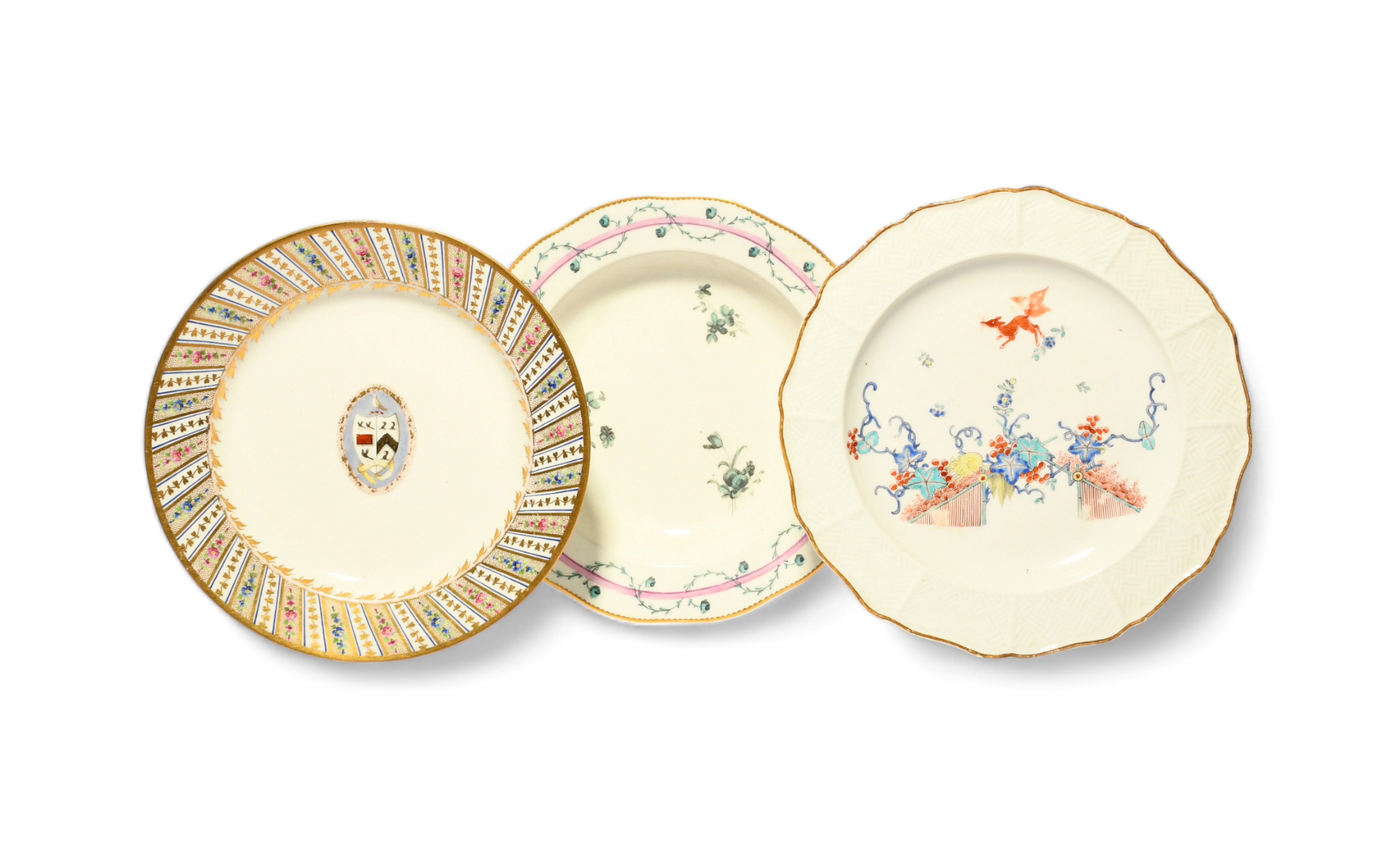 Three Derby plates or dishes, c.1780-1800, one with an armorial shield to the well, the rim with a Sèvres-style border of diagonal flower stems, one a soup plate painted with green camaieu flowers around a pink ribbon band, the last probably made as a replacement for a Meissen service, decorated in Kakiemon enamels with a flying red fox above a squirrel and grapevine, blue and puce factory marks, 24.5cm max. (3)