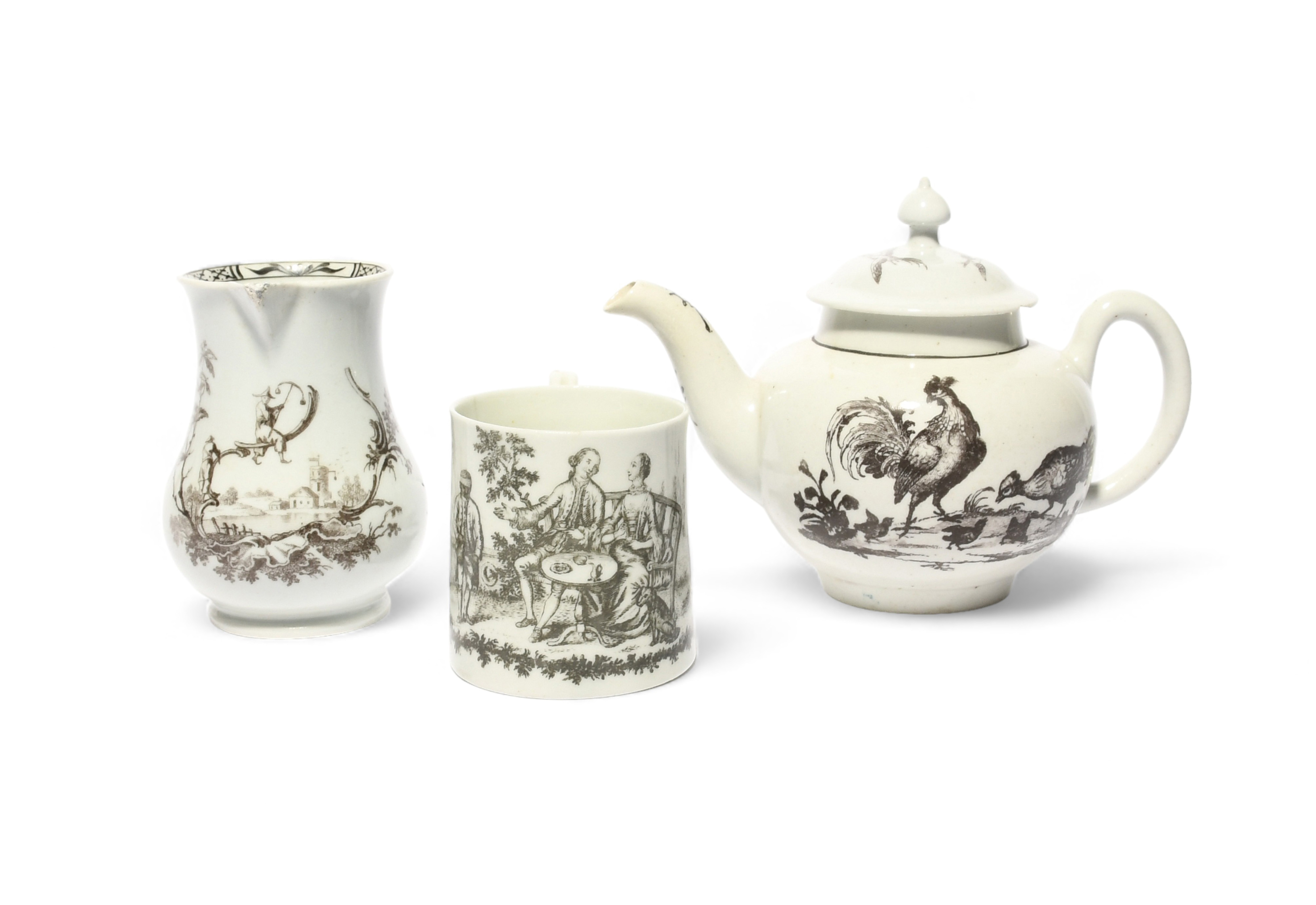A small Worcester teapot and cover, c.1758-60, printed in black with a cock, hen and chicks, the reverse with peewits, a sparrowbeak jug printed with Les Garçons Chinois, and a Worcester coffee can or small mug printed by John Sadler with the Tea Drinkers, small damages, 14.3cm max. (4)