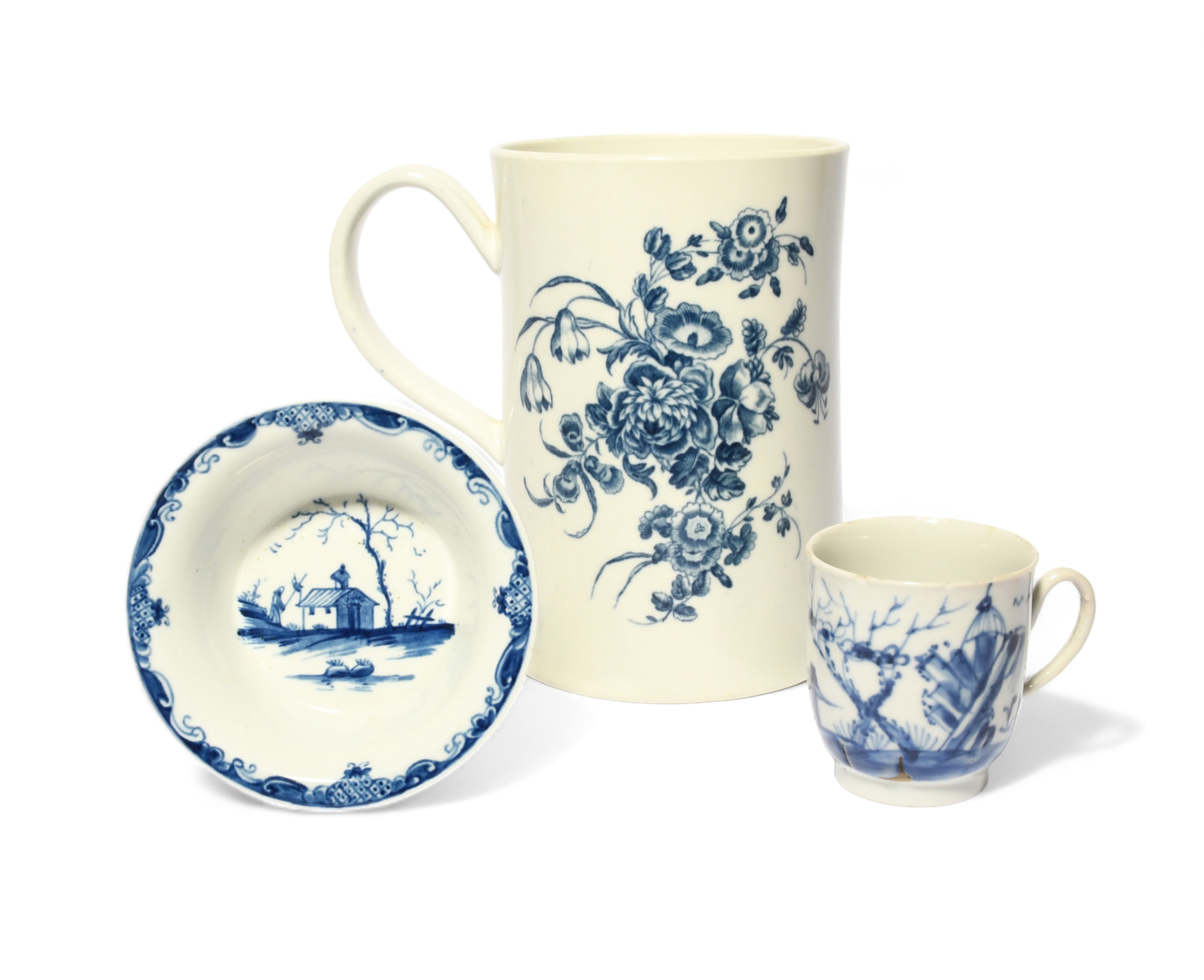 A Worcester blue and white patty pan and a mug , c.1760- 70, the patty pan painted with the Bare Tree and Speared Bird pattern, the rim with a formal design, workman's mark, the mug printed with the Bouquets pattern, and a Chinese Worcester style cup, painted with the Gazebo pattern, some chips to the Chinese cup, 15.5cm high max. (3)
