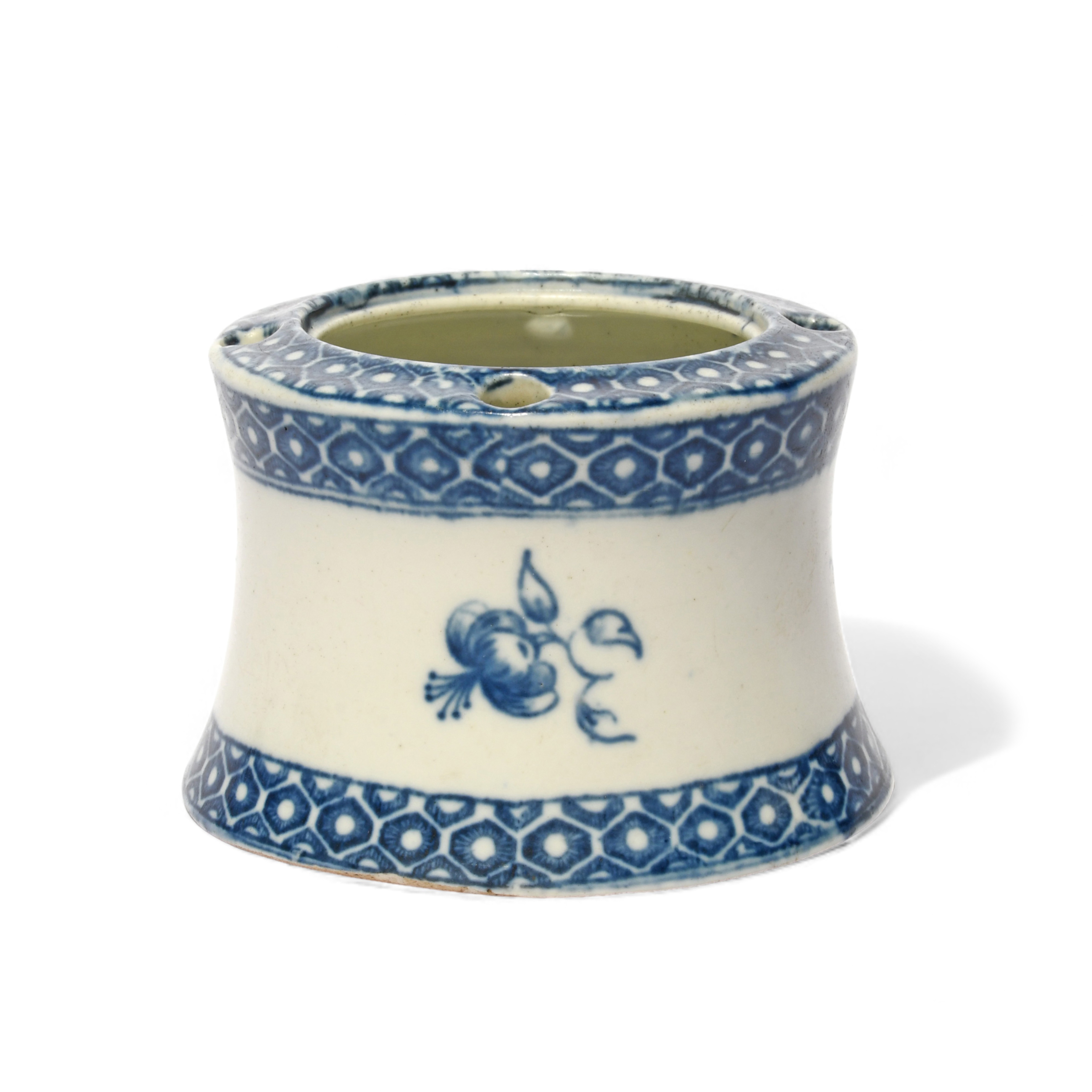 A rare Caughley blue and white inkwell, c.1780, of capstan shape, printed with small flower sprigs between cell diaper borders, the shoulder pierced with four quill holes, blue C mark, the liner lacking, 8.2cm across.