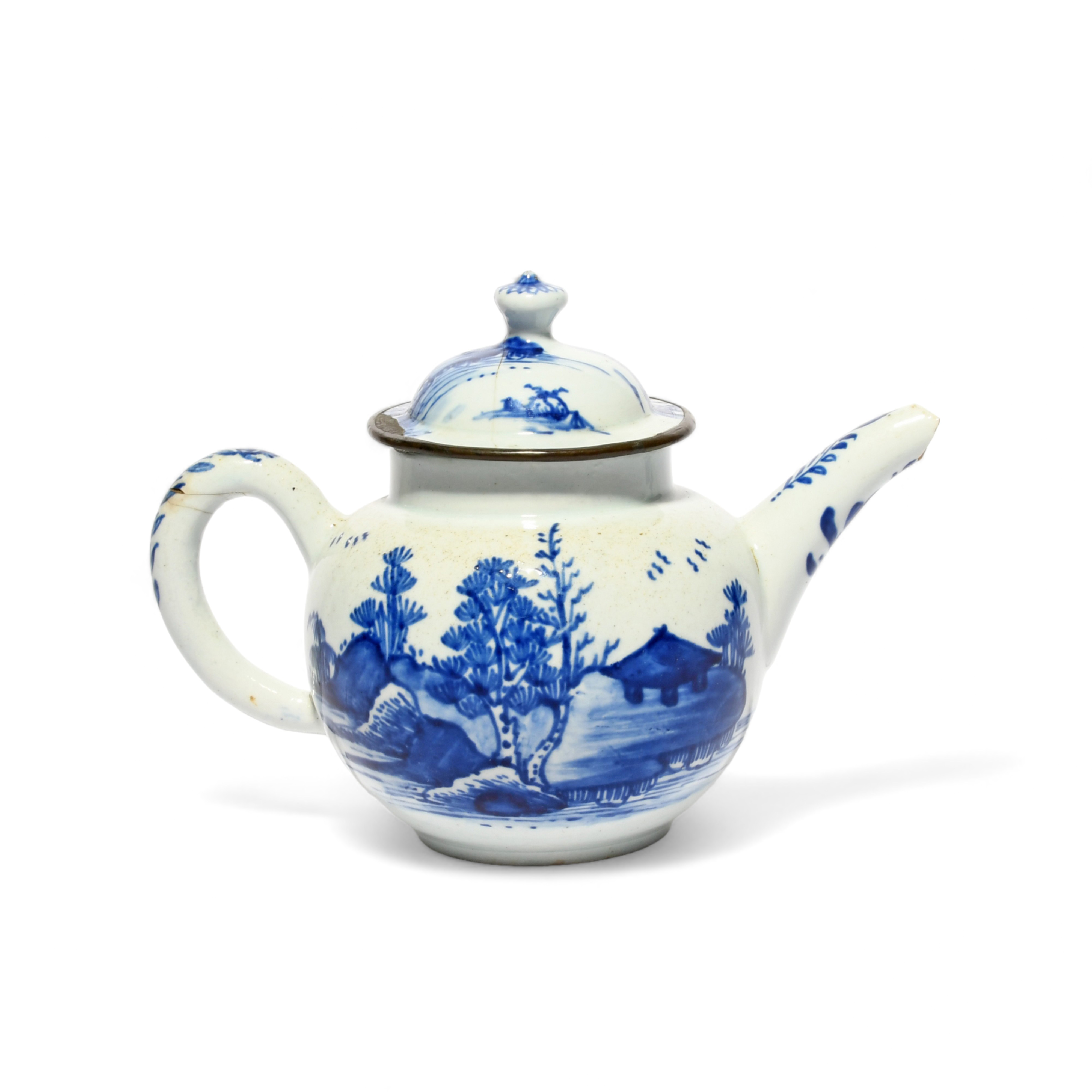 A small and rare Vauxhall blue and white teapot and cover, c.1756-58, the globular body painted with a small hut and trees in an island landscape, some damages, the cover with a metal repair to the rim, 13.5cm across. (2)