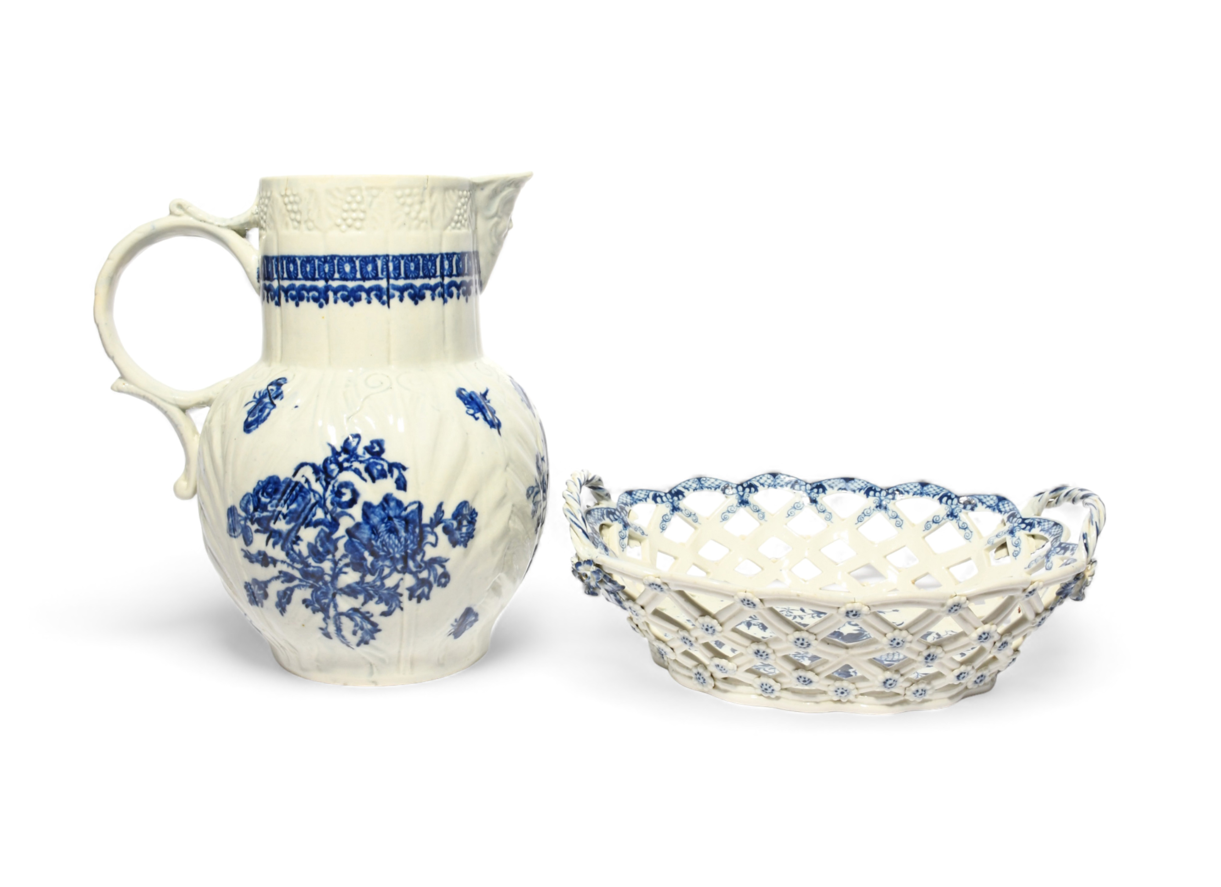 A large Seth Pennington (Liverpool) blue and white cabbage leaf jug, c.1780, decorated with naturalistic flower sprays and flying moths, the spout moulded as a bacchanalian mask, and a Worcester oval basket, printed with the Pinecone pattern, 27cm max. (2)