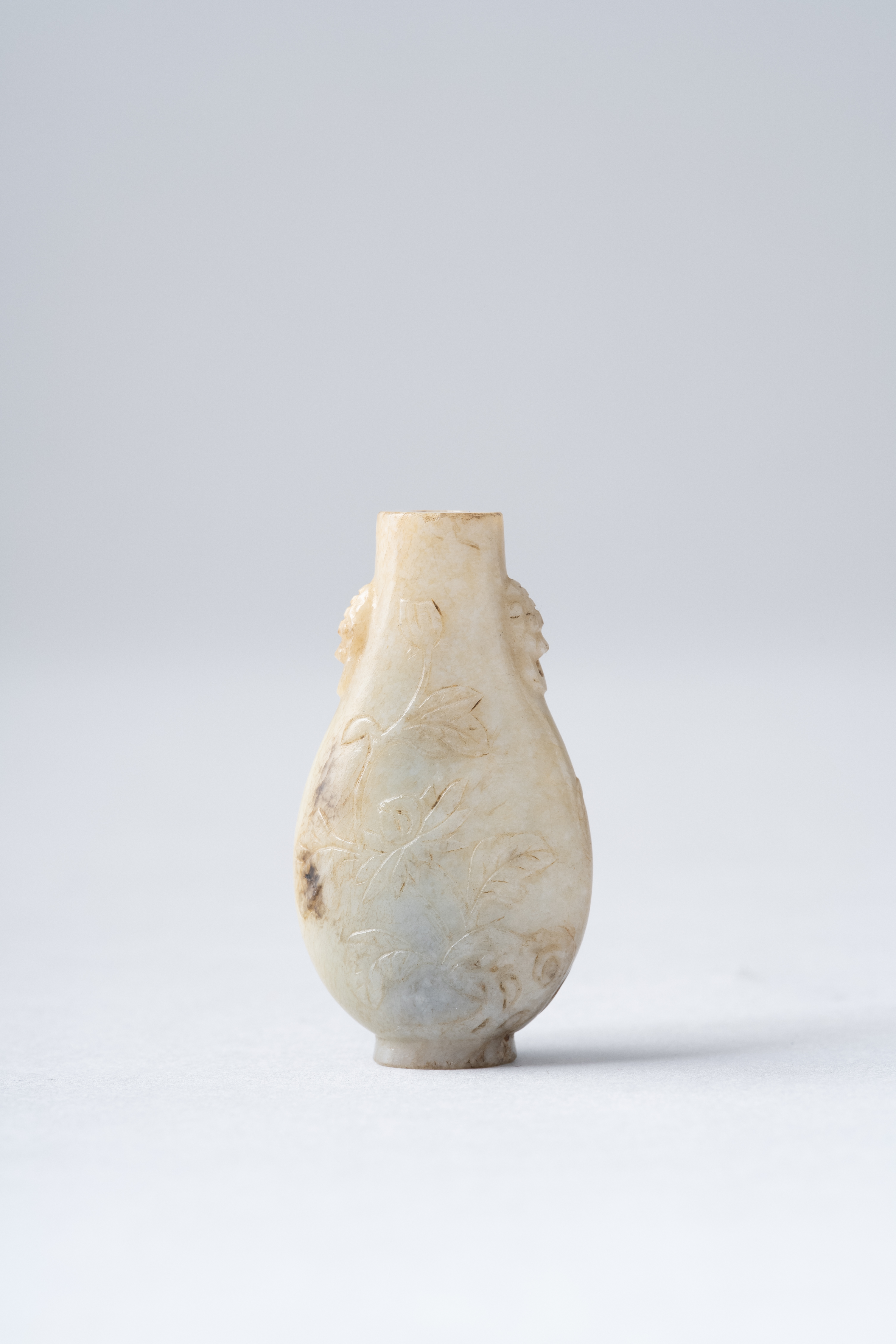 The bottle of flattened pear-shape, carved with small lion-mask and fixed ring handles, and with flower sprays and rockwork around the vessel, above an oval ring foot, the stone with areas of darker markings, with a paper label for Dr and Mrs P H Plesch Collections, no.Hv5, 4.8cm.